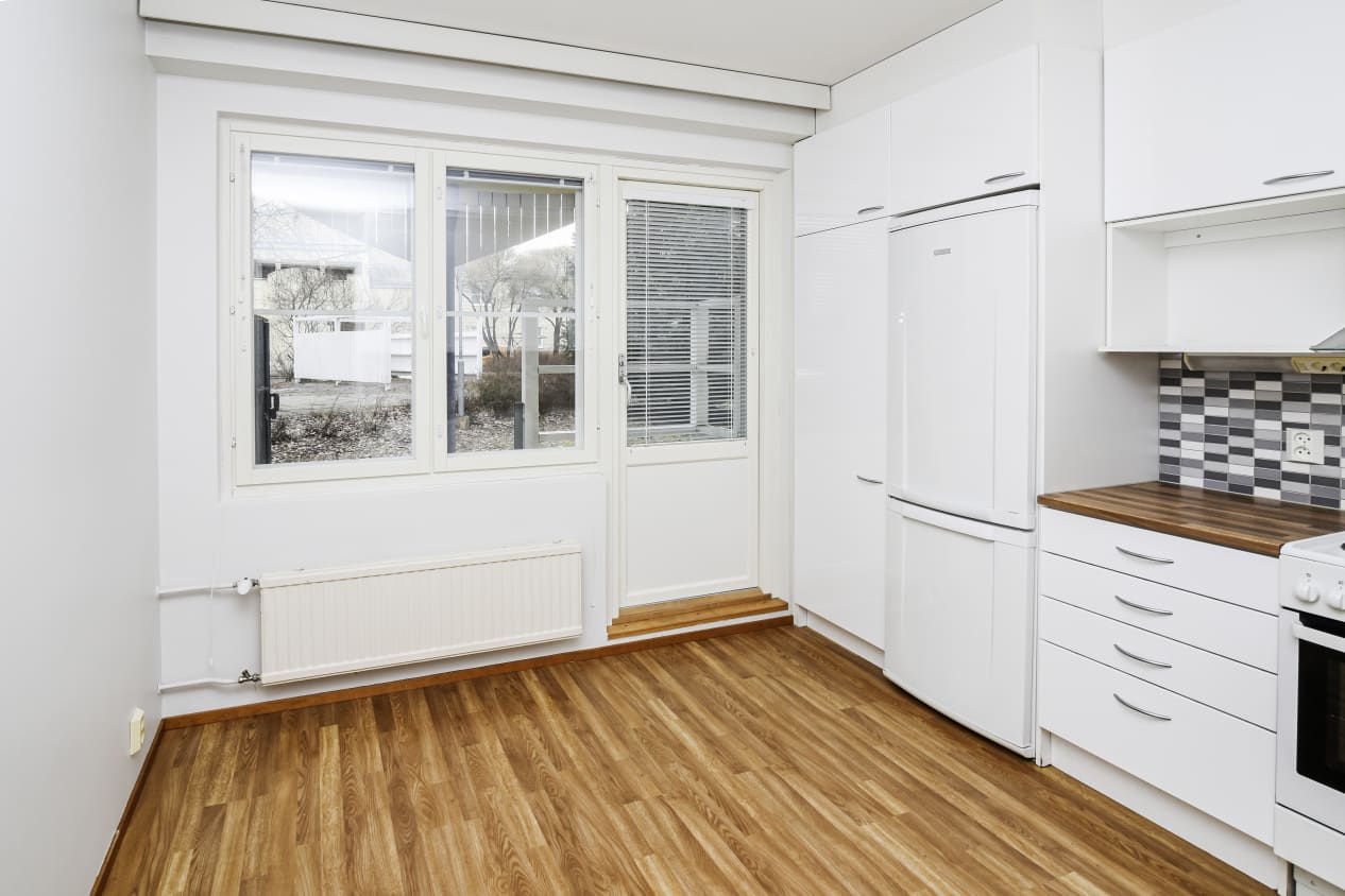 Vehreällä Niittymaalla sijaitsevan kaksion pohjaratkaisu on selkeä ja käytännöllinen. Keittiö on erillään olohuoneesta ja sinne mahtuu hyvin myös pieni ruokapöytä. Keittiöstä pääsee kodin omalle terassille.