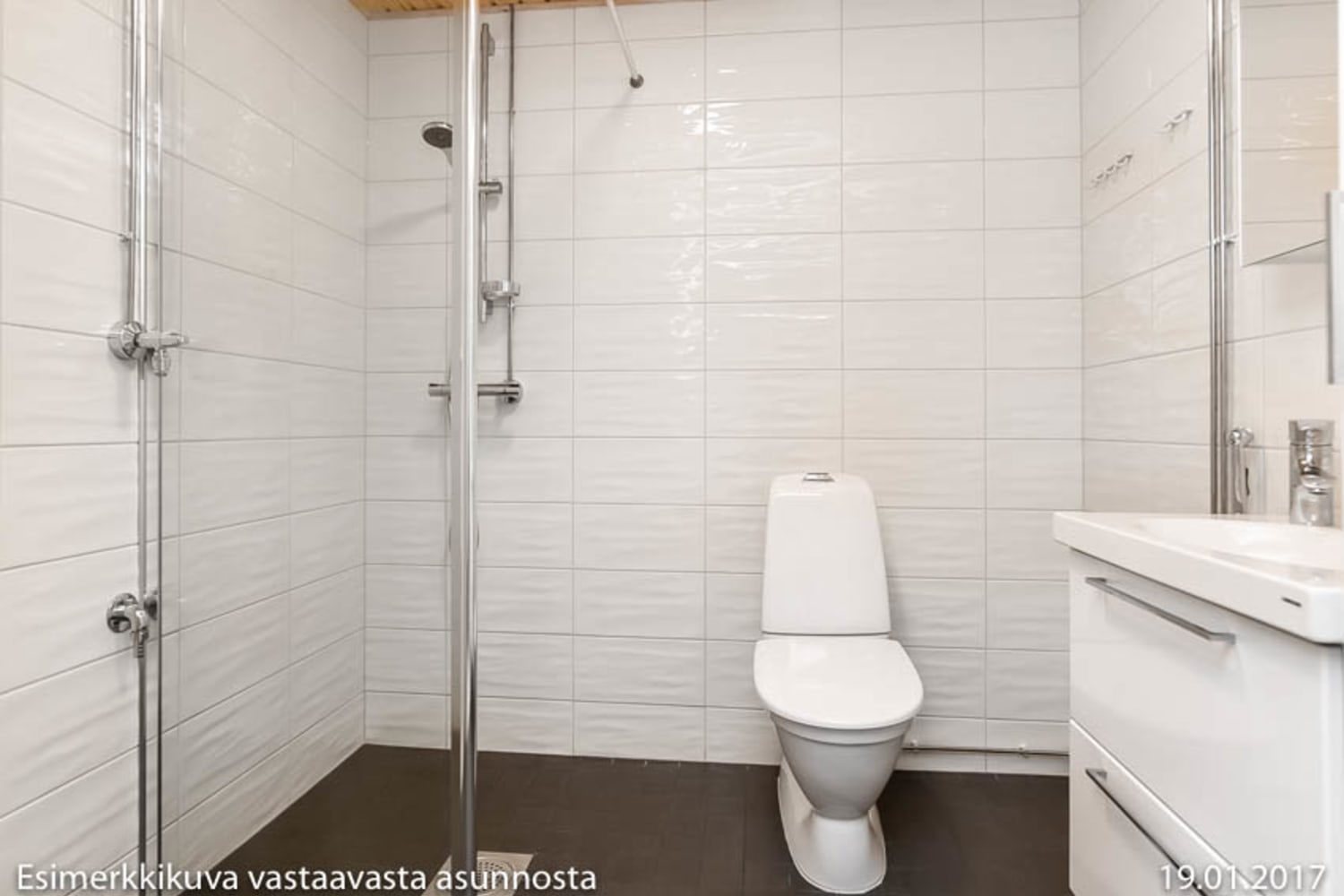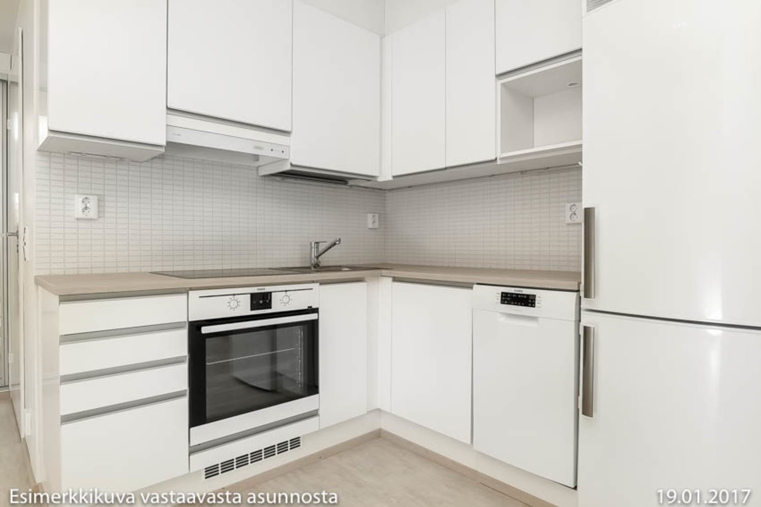 Asuintilojen lattiat ovat valkaistun tammen sävyistä laminaattia. Eteisen liukuovikaapistossa on peiliovet ja muut komerokalusteet ovat valkoisia. Keittiökaapistojen ovet ovat valkoiset ja ylä- ja alakaappien välinen tila on laatoitettu kiiltävillä valkoisilla laatoilla. Työtaso on valkoista puupintaa mukailevaa laminaattia. Varustukseen kuuluu keraaminen keittotaso ja erillisuuni, astianpesukone ja kylmälaitteet. Kylpyhuoneessa seinät ovat valkoista laattaa. Lattialaatat ovat tyylikkäästi hiilenharmaat ja vesikiertoinen lattialämmitys hellii jalkoja. Pesukoneelle ja kuivausrummulle on varaus.