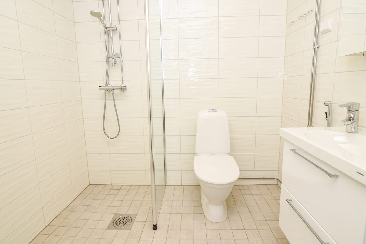 Asuintilojen lattiat ovat kodikkaasti tammilaminaattia. Eteisen liukuovikaapistossa on peiliovet ja muut komerokalusteet ovat valkoisia. Keittiökaapistojen ovet ovat valkoiset ja ylä- ja alakaappien välinen tila on laatoitettu kiiltävillä valkoisilla laatoilla. Työtaso on valkoista puupintaa mukailevaa laminaattia. Varustukseen kuuluu keraaminen keittotaso ja erillisuuni, astianpesukone ja kylmälaitteet. Kylpyhuoneessa seinät ovat valkoista laattaa. Lattialaatat ovat hillityn harmaat ja vesikiertoinen lattialämmitys hellii jalkoja. Pesukoneelle ja kuivausrummulle on varaus.