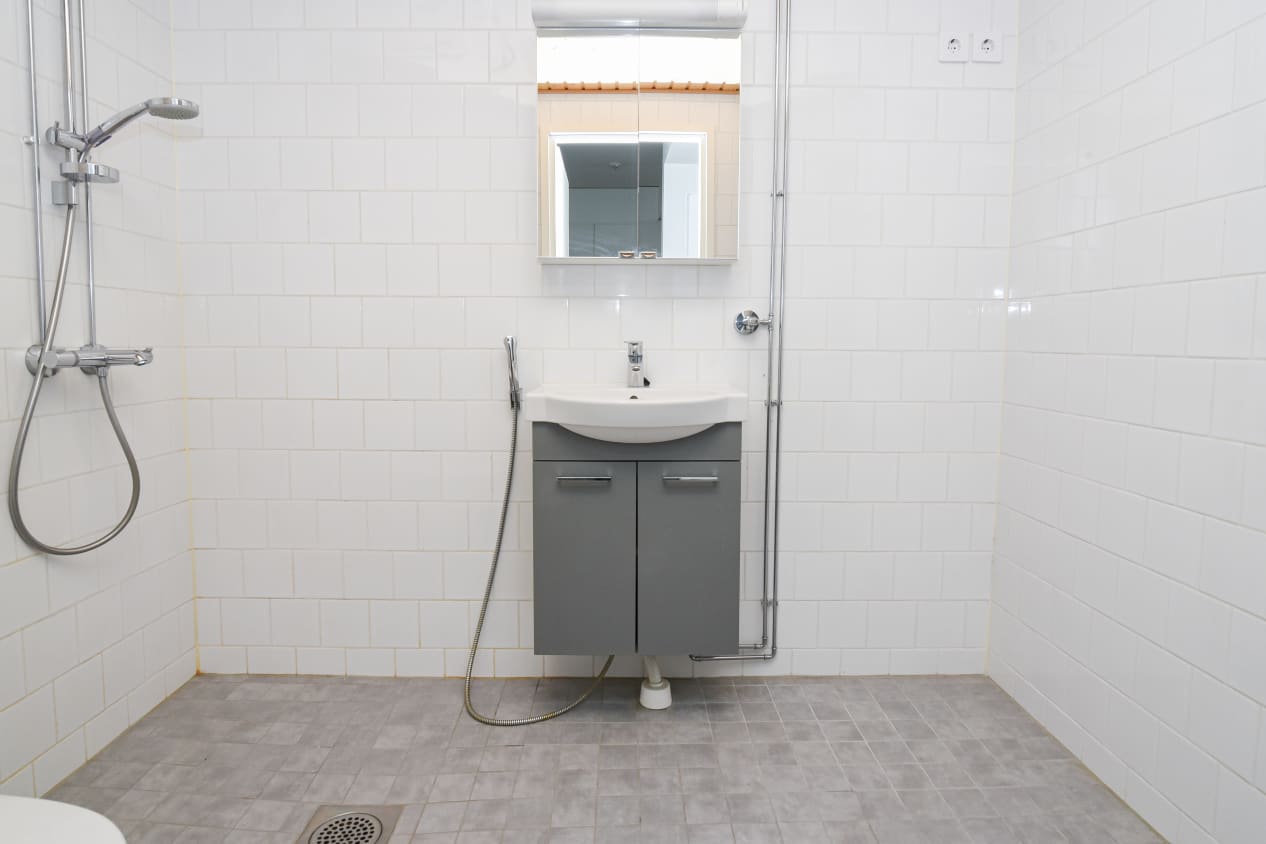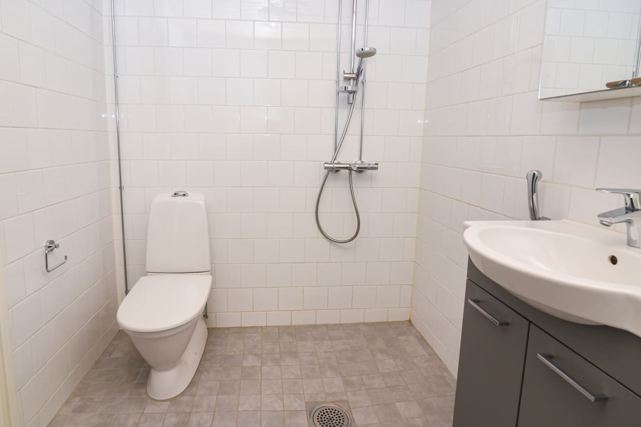 Huoneiston lattiat ovat tyylikästä laminaattia. Keittiön kaapistot ovat valkoiset ja kaapistojen välitila on laatoitettu valkoisella kiiltävällä laatalla tiililadontaa käyttäen. Työtaso on valkaistun tammen sävyistä laminaattia. Keittiön varusteisiin kuuluu valkoiset kodinkoneet, liesi, astianpesukone, jääkaappipakastin sekä varaus mikroaaltouunille. Kylpyhuoneen seinät ovat kiiltävän valkoista tiililadottua laattaa. Lattiat ovat väriltään harmaat. Kylpyhuoneen kalusteet ovat valkoiset, pyykinpesukoneelle ja kuivausrummulle on varaus.