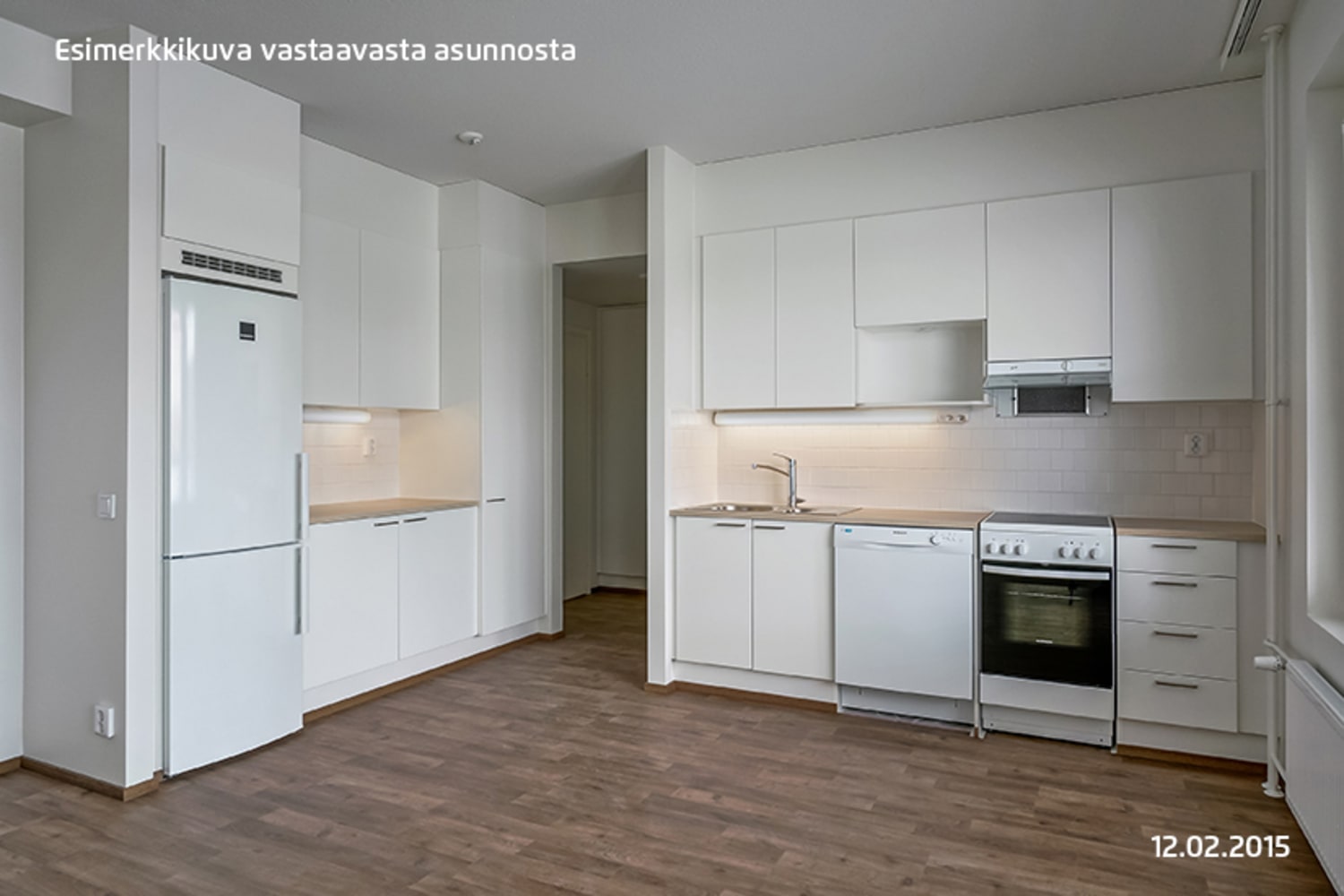 Huoneiston lattiat ovat tyylikästä laminaattia. Keittiön kaapistot ovat valkoiset ja kaapistojen välitila on laatoitettu valkoisella kiiltävällä laatalla tiililadontaa käyttäen. Työtaso on valkaistun tammen sävyistä laminaattia. Keittiön varusteisiin kuuluu valkoiset kodinkoneet, liesi, astianpesukone, jääkaappipakastin sekä varaus mikroaaltouunille. Kylpyhuoneen seinät ovat kiiltävän valkoista tiililadottua laattaa. Lattiat ovat väriltään harmaat. Kylpyhuoneen kalusteet ovat valkoiset, pyykinpesukoneelle ja kuivausrummulle on varaus.