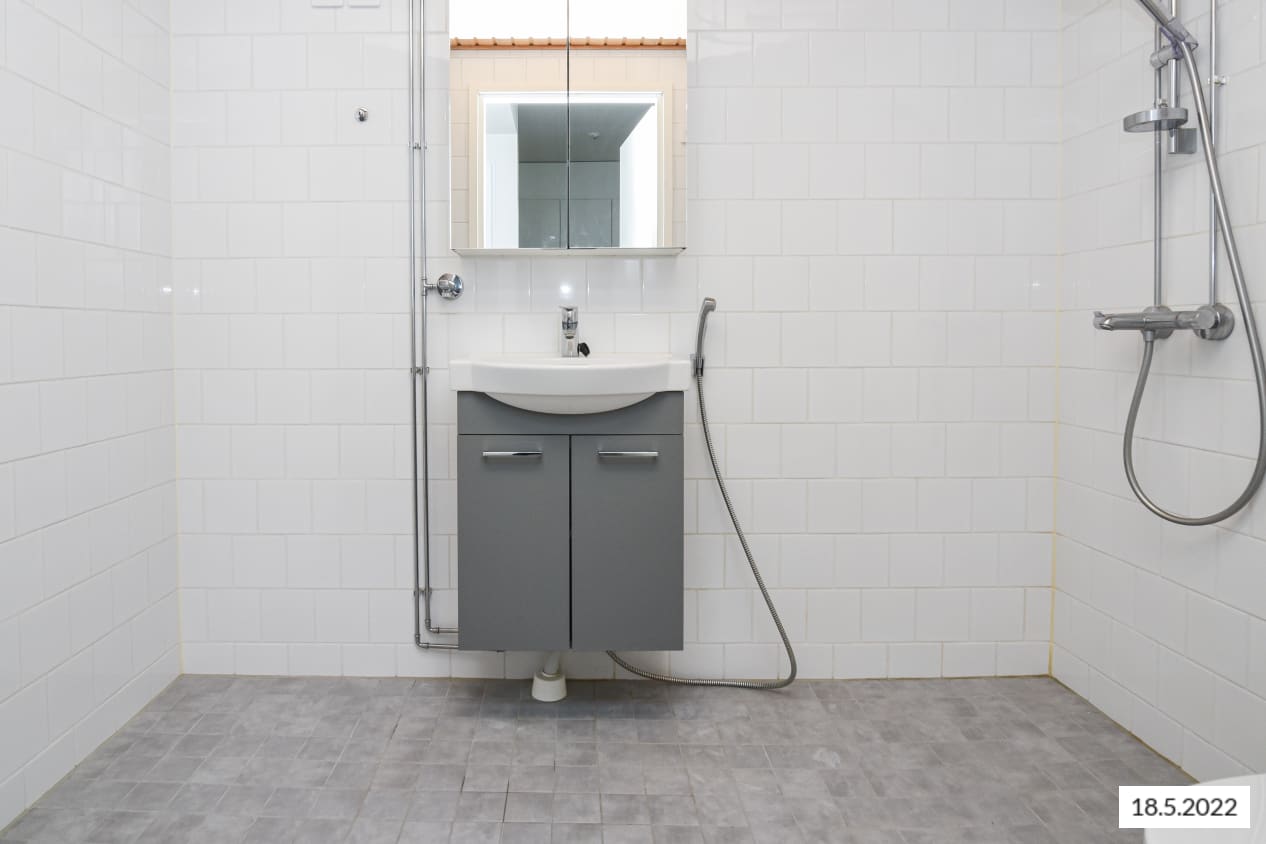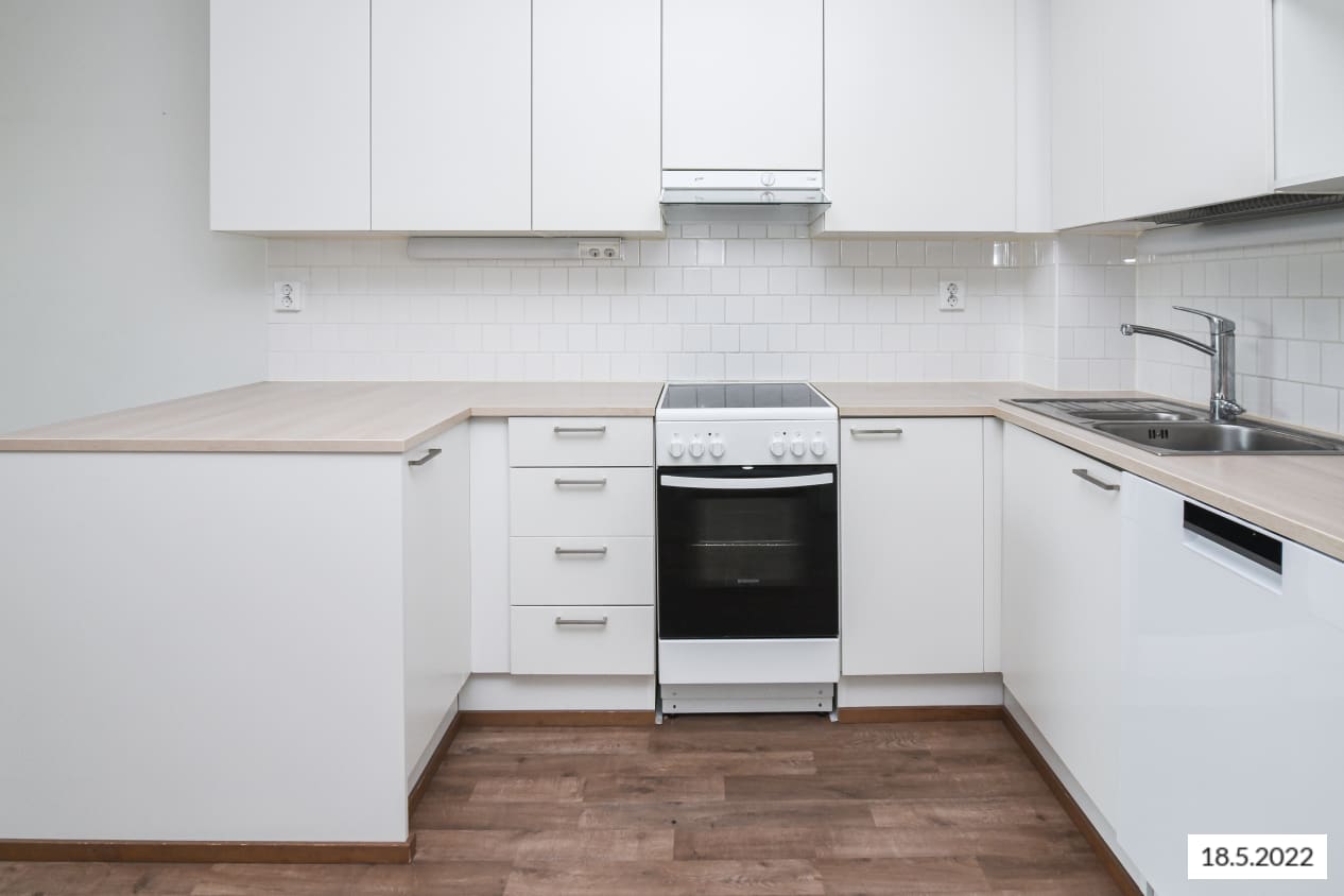 Huoneiston lattiat ovat tyylikästä laminaattia. Keittiön kaapistot ovat valkoiset ja kaapistojen välitila on laatoitettu valkoisella kiiltävällä laatalla tiililadontaa käyttäen. Työtaso on valkaistun tammen sävyistä laminaattia. Keittiön varusteisiin kuuluu valkoiset kodinkoneet, liesi, astianpesukone, jääkaappipakastin sekä varaus mikroaaltouunille. Kylpyhuoneen seinät ovat kiiltävän valkoista tiililadottua laattaa. Lattiat ovat väriltään harmaat. Kylpyhuoneen kalusteet ovat valkoiset, pyykinpesukoneelle ja kuivausrummulle on varaus.