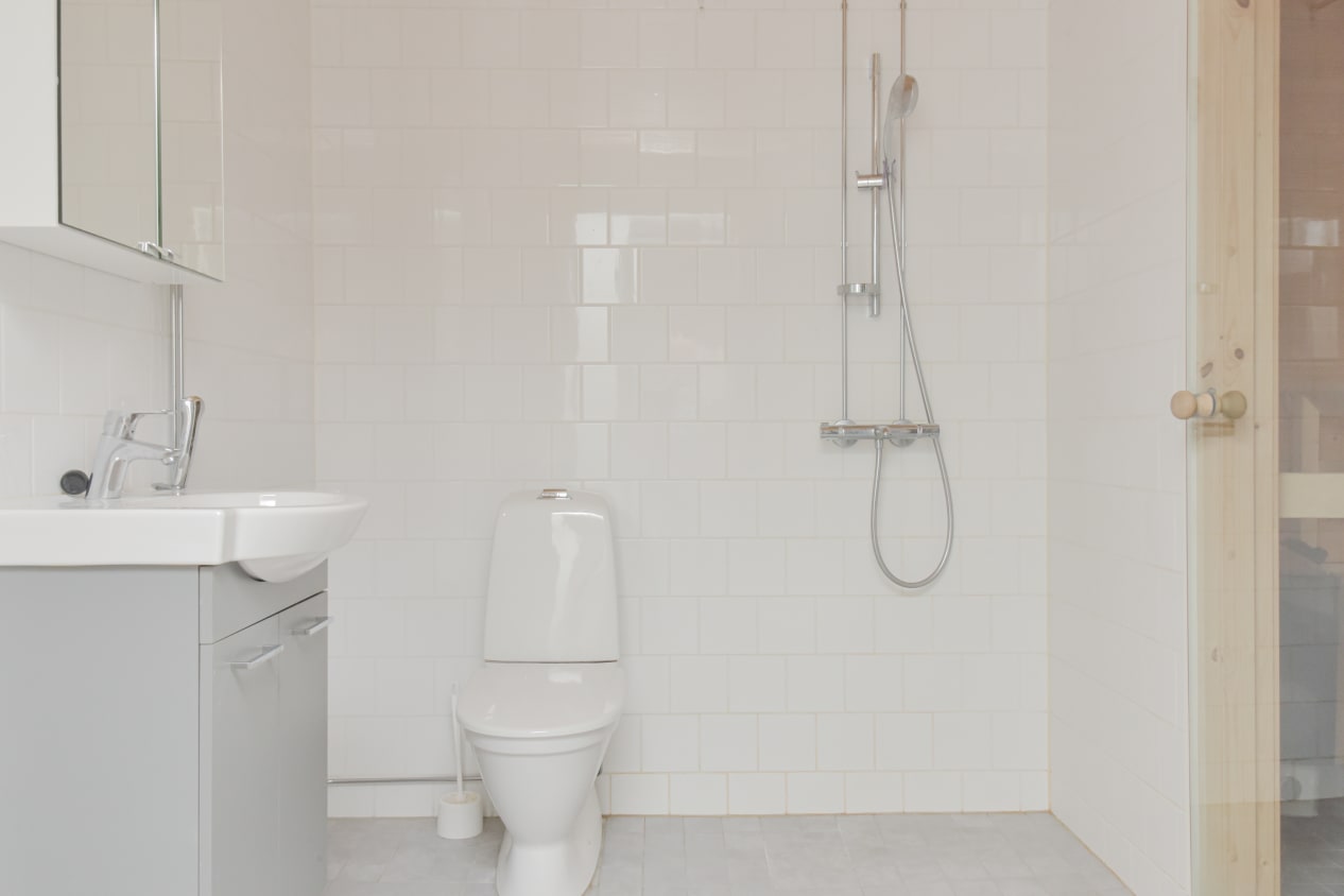 Huoneiston lattiat ovat tyylikästä laminaattia. Keittiön kaapistot ovat valkoiset ja kaapistojen välitila on laatoitettu valkoisella kiiltävällä laatalla tiililadontaa käyttäen. Työtaso on valkaistun tammen sävyistä laminaattia. Keittiön varusteisiin kuuluu valkoiset kodinkoneet, liesi, astianpesukone, jääkaappipakastin sekä varaus mikroaaltouunille. Kylpyhuoneen seinät ovat kiiltävän valkoista tiililadottua laattaa. Lattiat ovat väriltään harmaat. Kylpyhuoneen kalusteet ovat valkoiset, pyykinpesukoneelle ja kuivausrummulle on varaus.