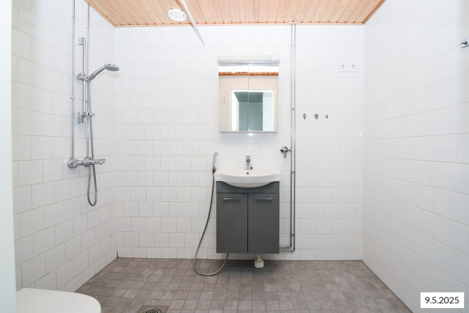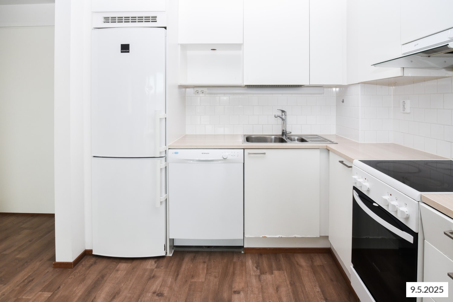 Huoneiston lattiat ovat tyylikästä laminaattia. Keittiön kaapistot ovat valkoiset ja kaapistojen välitila on laatoitettu valkoisella kiiltävällä laatalla tiililadontaa käyttäen. Työtaso on valkaistun tammen sävyistä laminaattia. Keittiön varusteisiin kuuluu valkoiset kodinkoneet, liesi, astianpesukone, jääkaappipakastin sekä varaus mikroaaltouunille. Kylpyhuoneen seinät ovat kiiltävän valkoista tiililadottua laattaa. Lattiat ovat väriltään harmaat. Kylpyhuoneen kalusteet ovat valkoiset, pyykinpesukoneelle ja kuivausrummulle on varaus.
