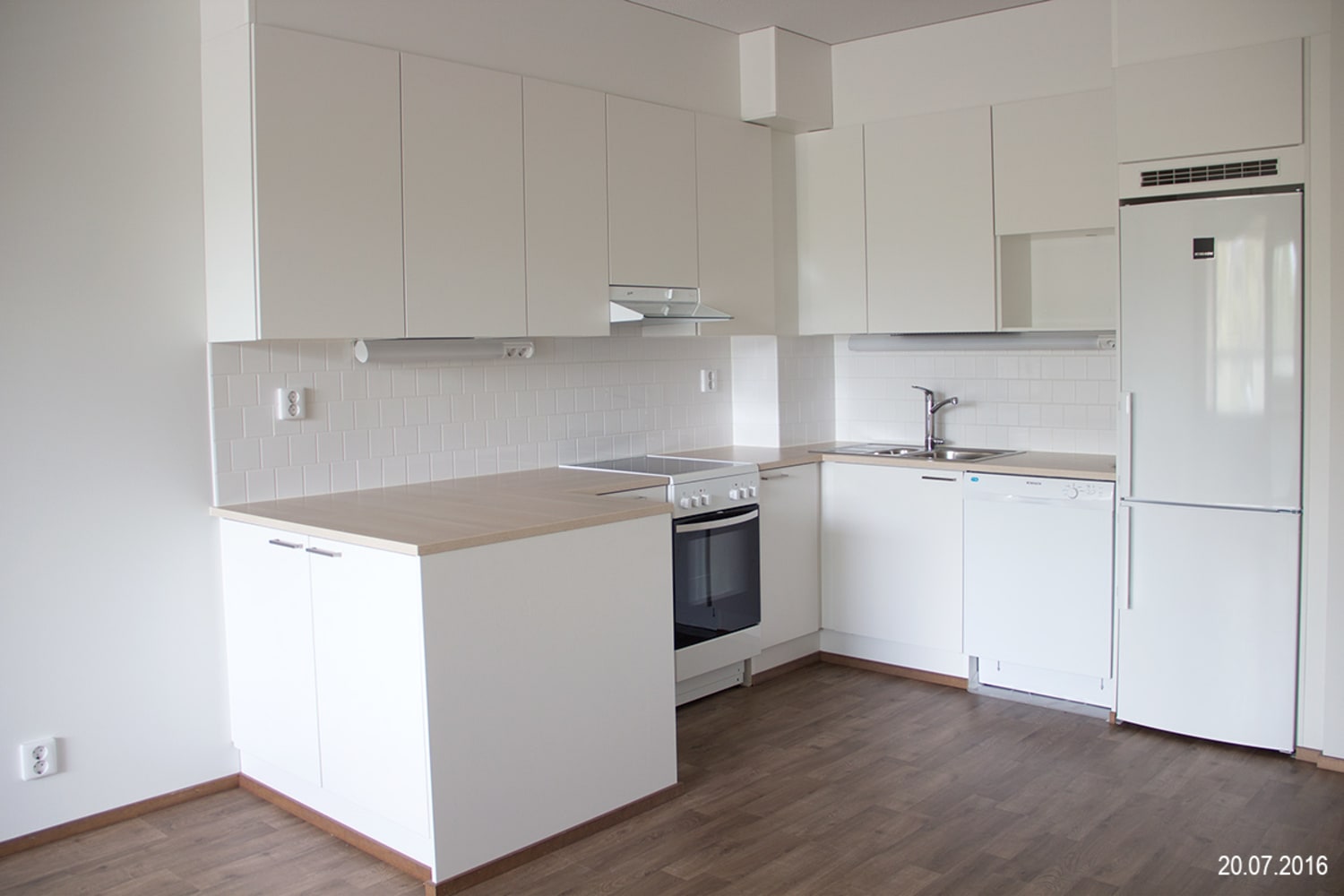 Huoneiston lattiat ovat tyylikästä laminaattia. Keittiön kaapistot ovat valkoiset ja kaapistojen välitila on laatoitettu valkoisella kiiltävällä laatalla tiililadontaa käyttäen. Työtaso on valkaistun tammen sävyistä laminaattia. Keittiön varusteisiin kuuluu valkoiset kodinkoneet, liesi, astianpesukone, jääkaappipakastin sekä varaus mikroaaltouunille. Kylpyhuoneen seinät ovat kiiltävän valkoista tiililadottua laattaa. Lattiat ovat väriltään harmaat. Kylpyhuoneen kalusteet ovat valkoiset, pyykinpesukoneelle ja kuivausrummulle on varaus.