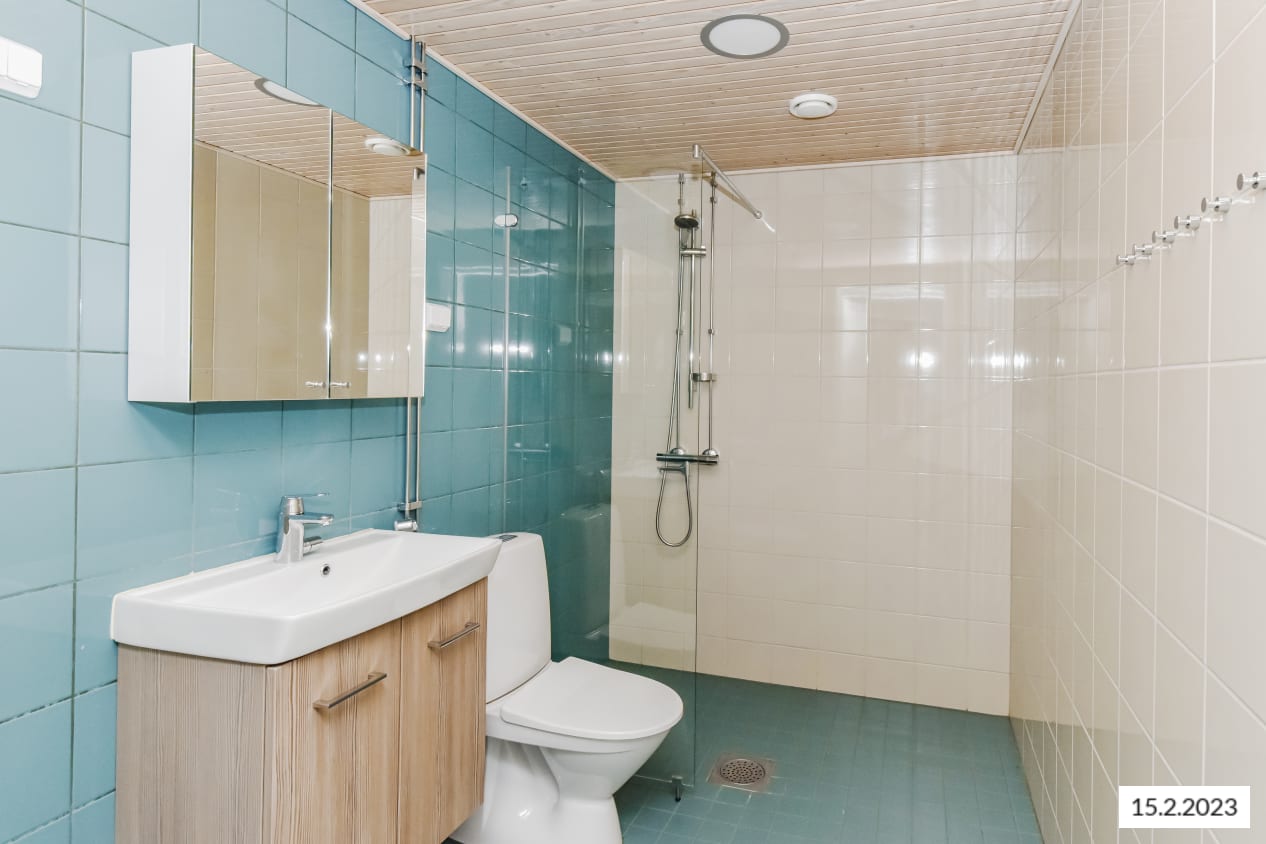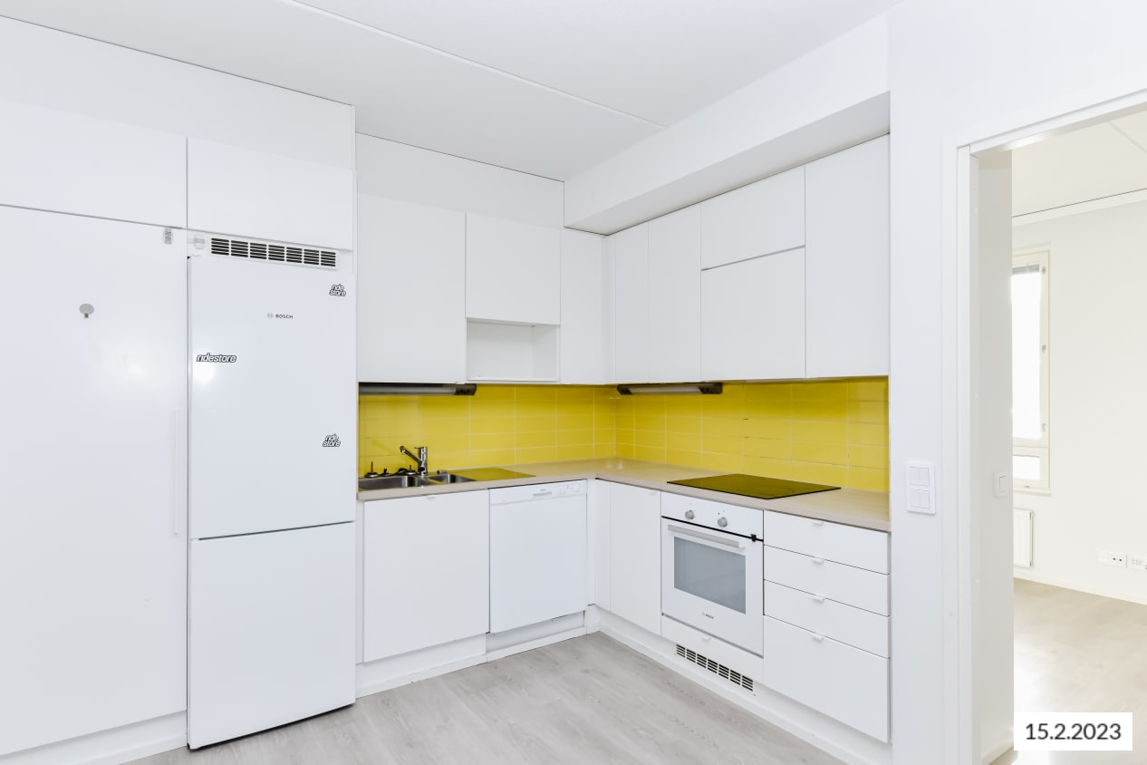 Vaaleasävyisen kodin lattiat ovat kaunista vaaleaa tammilankkua mukailevaa laminaattia. Keittiön kaapistot ovat raikkaan valkoiset ja ylä- ja alakaappien välinen tila on laatoitettu mausteisen keltaisella laatalla. Laminaattityötaso on vaalean tammen sävyinen. Varustukseen kuuluu keraaminen liesitaso ja kalusteuuni, jääkaappipakastin ja astianpesukone. Kokonaan laatoitetun kylpyhuoneen pääosin vaaleita seiniä elävöittää kaunis turkoosiin vivahtava tehosteseinä. Pesukoneelle ja kuivausrummulle on tilavaraus.