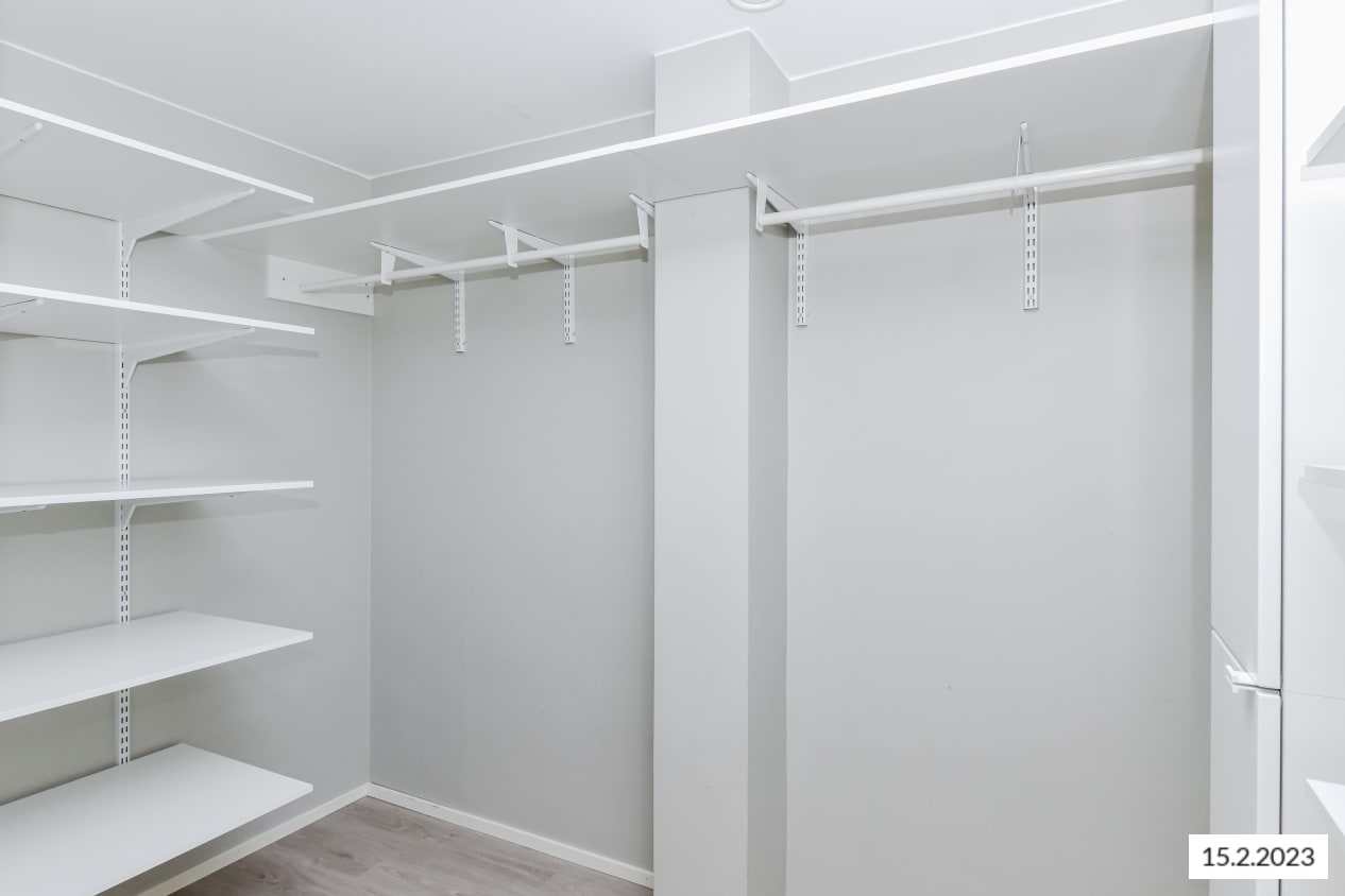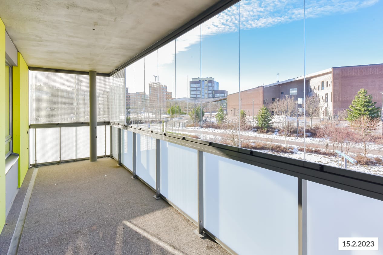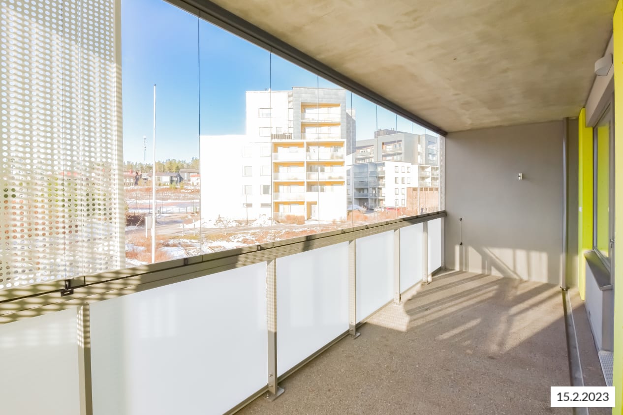 Valoisan nurkka-asunnon keittiö ja olohuone muodostavat yhtenäisen, avaran tilan, joka on helppo kalustaa viihtyisäksi. Makuuhuoneet ovat omassa rauhassaan talon ulkoseinustalla. Reilunkokoisessa vaatehuoneessa on mukavasti tilaa vaatesäilytykselle. Lasitettu parveke suuntautuu ilta-auringon puolelle.