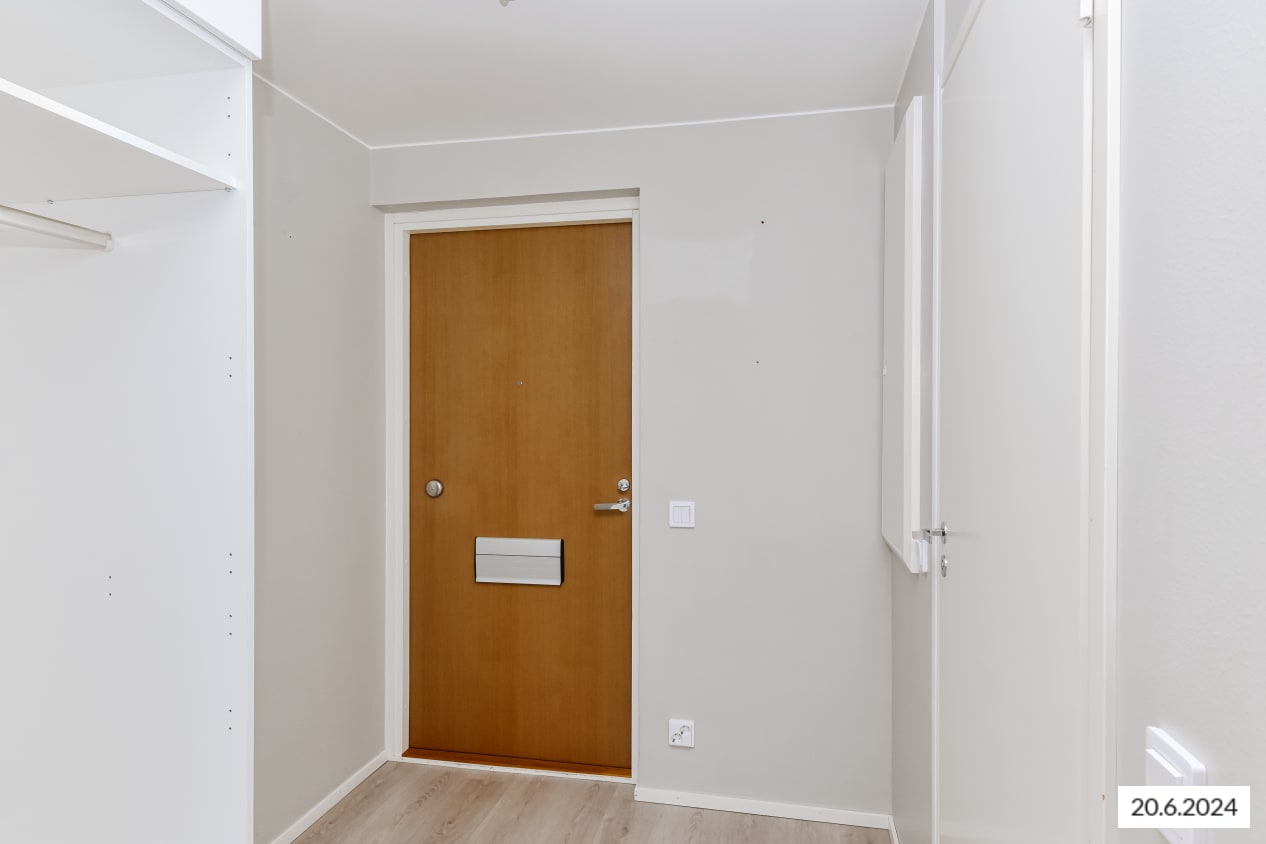 Valoisan kodin lattiat ovat kaunista vaaleaa tammilankkua mukailevaa laminaattia. Keittiön kaapistot ovat raikkaan valkoiset ja ylä- ja alakaappien välinen tila on laatoitettu mausteisen keltaisella laatalla. Laminaattityötaso on vaalean tammen sävyinen. Varustukseen kuuluu keraaminen liesitaso ja kalusteuuni, jääkaappipakastin ja astianpesukone. Kokonaan laatoitetun kylpyhuoneen pääosin vaaleita seiniä elävöittää kaunis turkoosiin vivahtava tehosteseinä. Pesukoneelle ja kuivausrummulle on tilavaraus.
