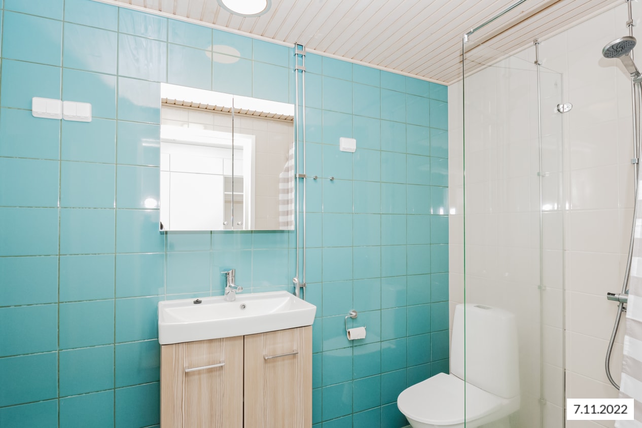 Kokonaan laatoitetun kylpyhuoneen pääosin vaaleita seiniä elävöittää kaunis turkoosiin vivahtava tehosteseinä. Pesukoneelle ja kuivausrummulle on tilavaraus.