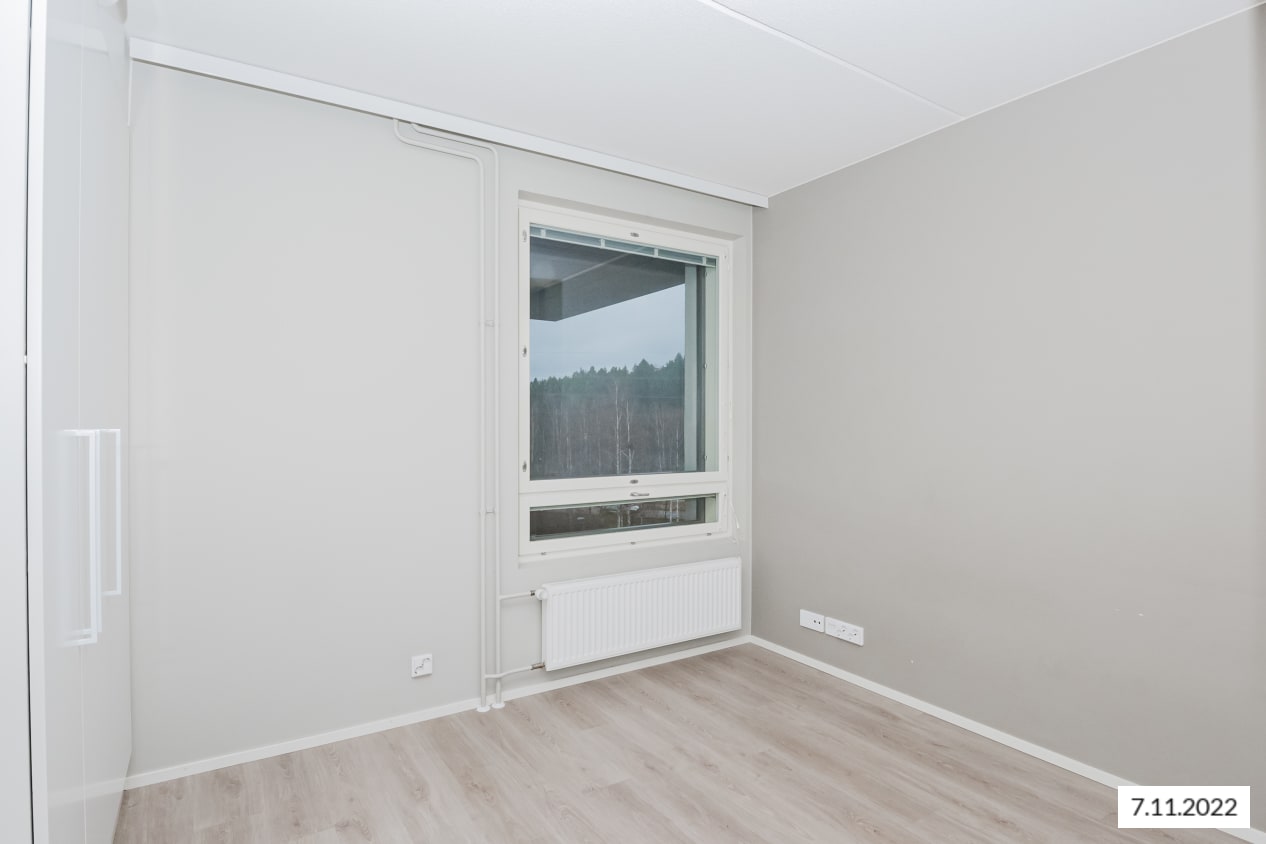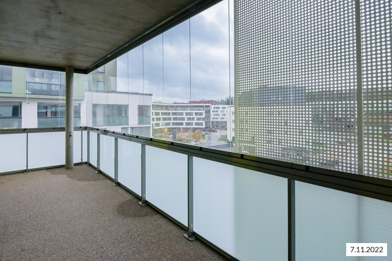 Valoisan kulmahuoneiston keittiö ja olohuone muodostavat avaran tilan, joka on helppo kalustaa viihtyisäksi. Keittiössä ruokapöytä sopii kodikkaasti ikkunan alle. Makuuhuone on erotettu olohuoneesta tilaa säästävällä liukuovella. Kodin lisäilo on lasitettu eteläparveke, jonka voi sisustaa mieleisellään tavalla. Varhain keväällä auringonvalosta lämpiävä tila on viherpeukalon unelmien keidas.