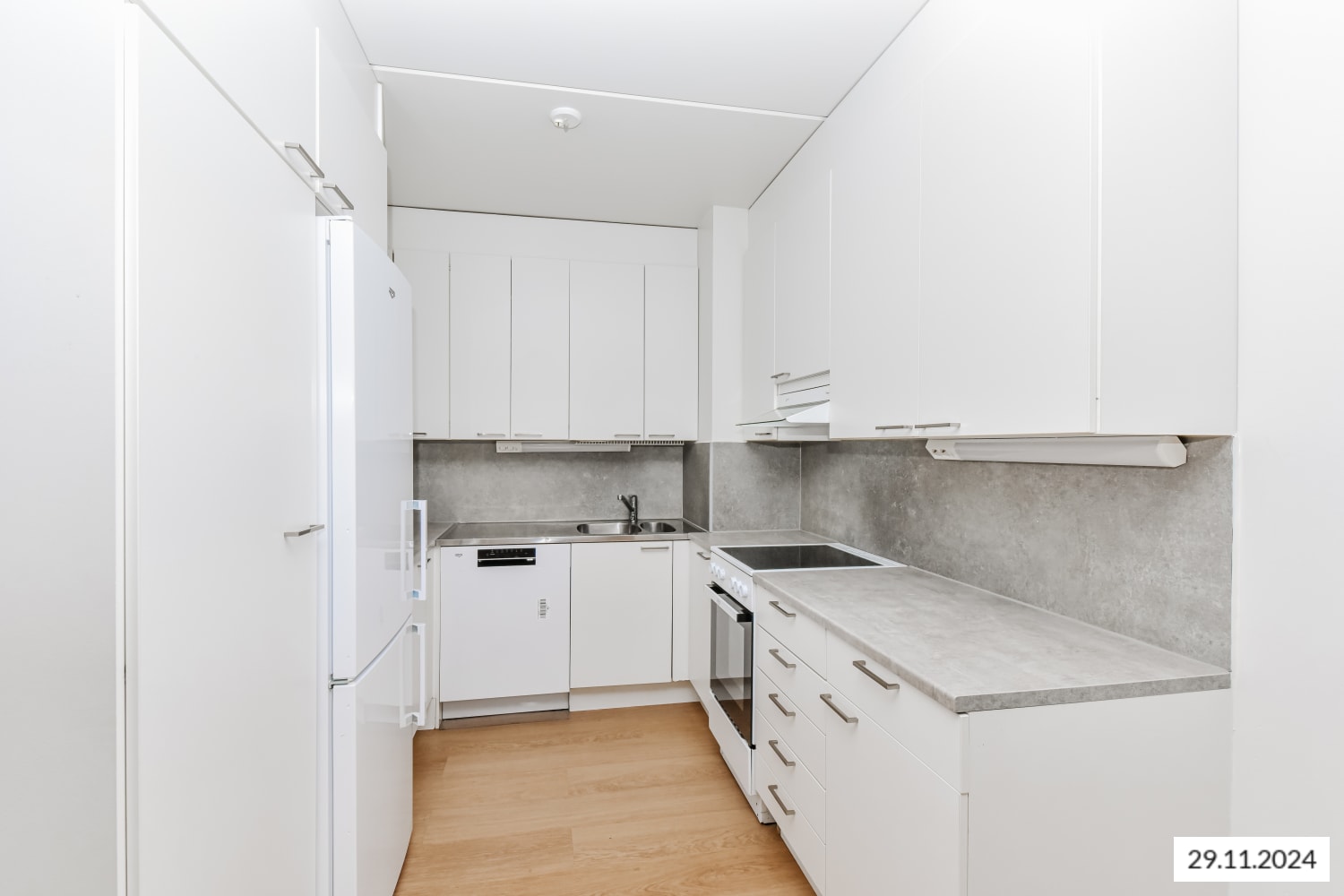 Keittiössä on jää-pakastinkaappi ja nelilevyinen sähköliesi.