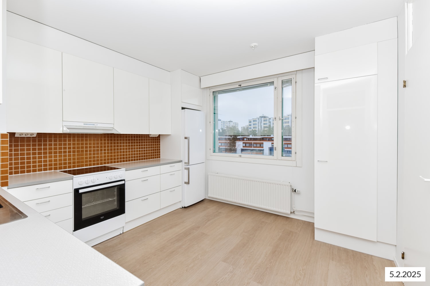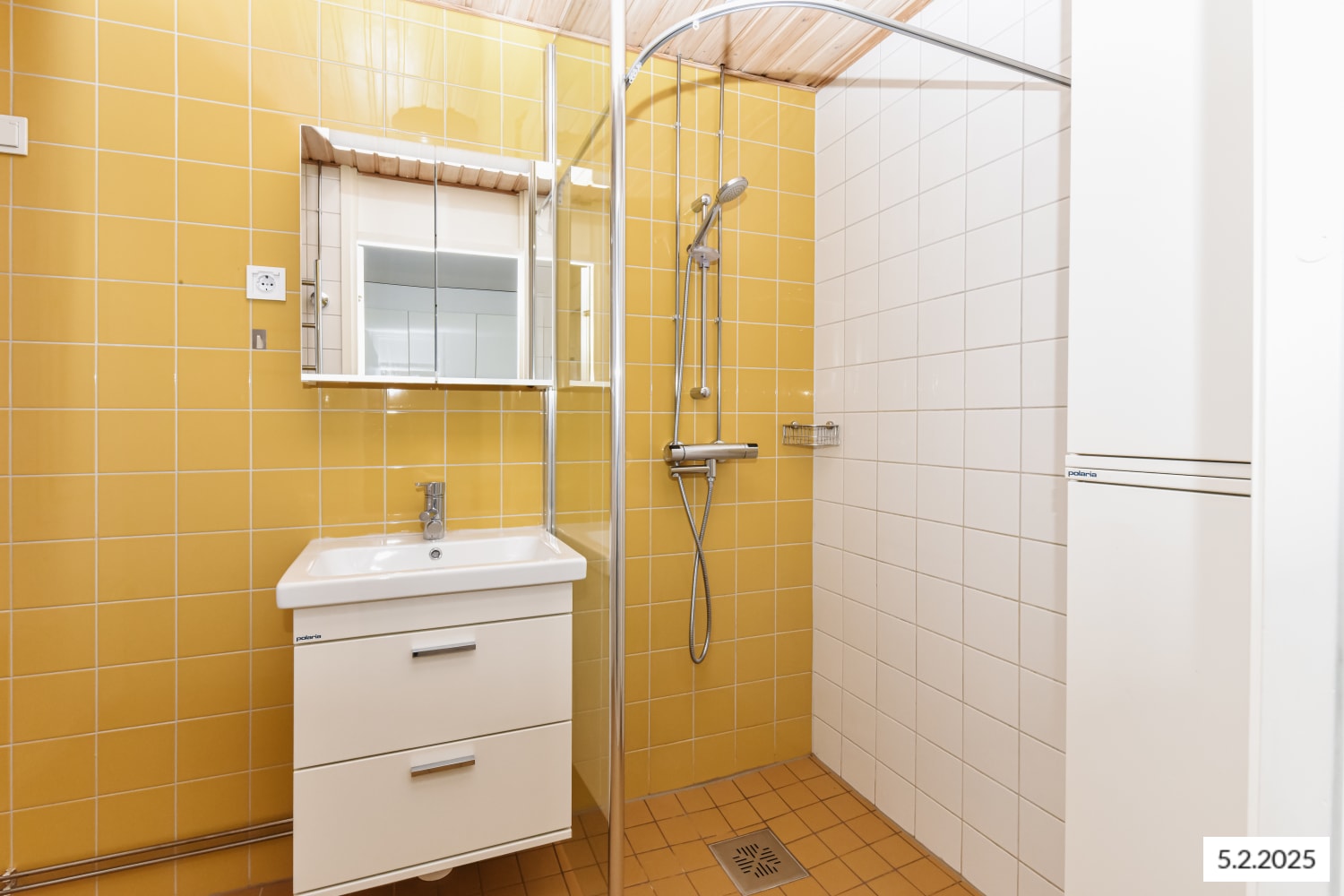 Vaaleasävyisen asunnon lattiat ovat valkaistua tammilankkua mukailevaa laminaattia. Keittiöissä on kiiltävän valkoiset kaapistot ja laminaattityötasot upotettuine teräksisine tiskialtaineen. Kaapistojen ja tason välinen tila on laatoitettu mausteisen keltaisella laatalla. Keittiön varusteisiin kuuluu keraaminen liesi, astianpesukone, jääkaappipakastin sekä varaus mikroaaltouunille. Kylpyhuoneessa ja wc:ssä on raikkaan valkoiset seinälaatat, joita keltaiset lattialaatat ja tehosteseinä piristävät. Pyykinpesukoneelle ja kuivausrummulle on varaus.