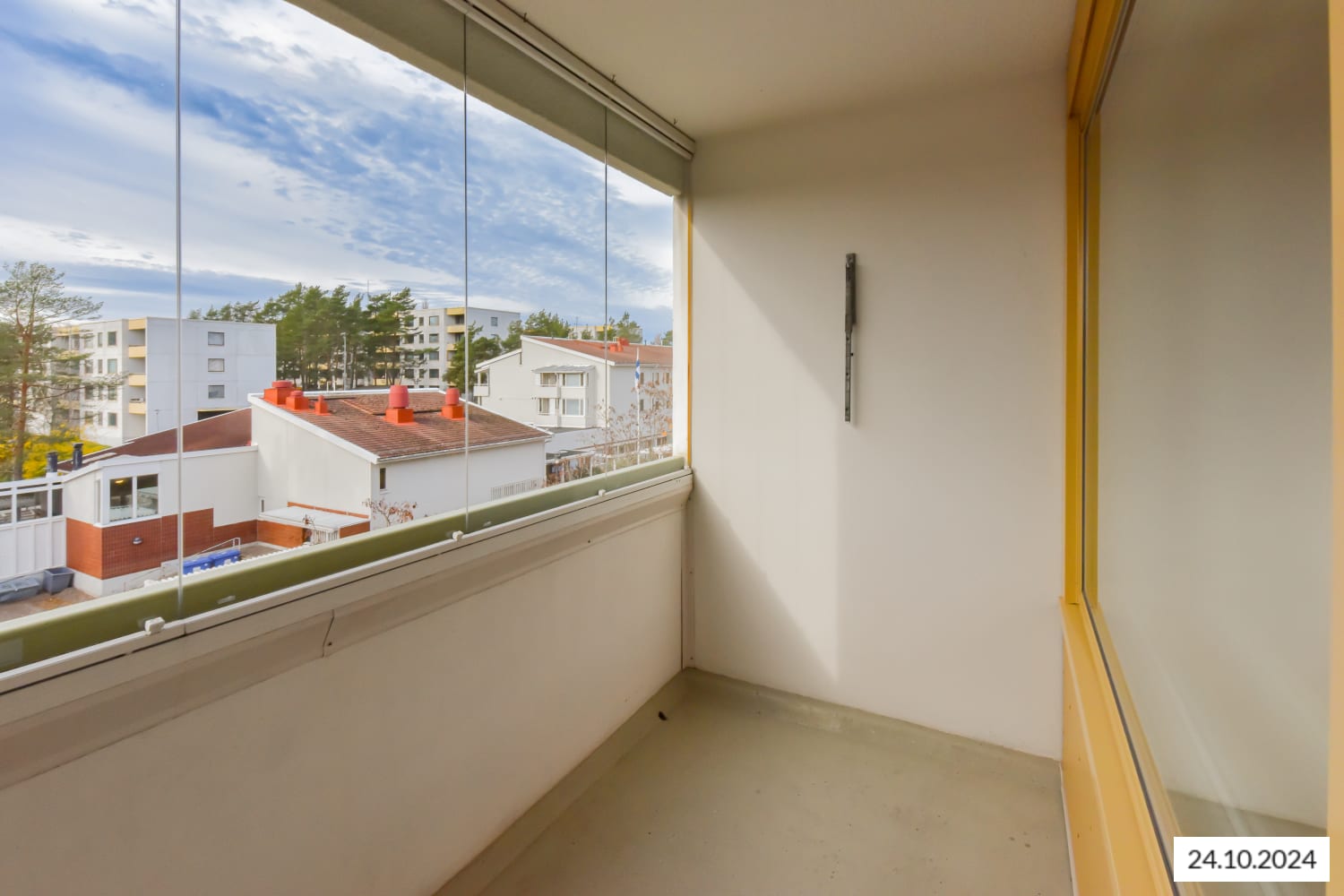 Toiseksi ylimmän kerroksen läpitalon kaksion avarasta olohuoneesta on käynti lasitetulle länsiparvekkeelle, jossa viihtyy viileämpinäkin iltoina. Reilun kokoiseen keittiöön mahtuu kunnollinen ruokapöytä kodikkaasti ikkunan alle.