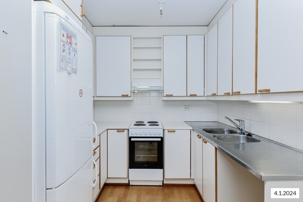Asuinhuoneissa on siistit parkettilattiat. Kylpyhuoneessa on kosteiden tilojen muovimatto ja kaakeloidut seinät. Keittiössä on jää-pakastinkaappi ja nelilevyinen sähköliesi.