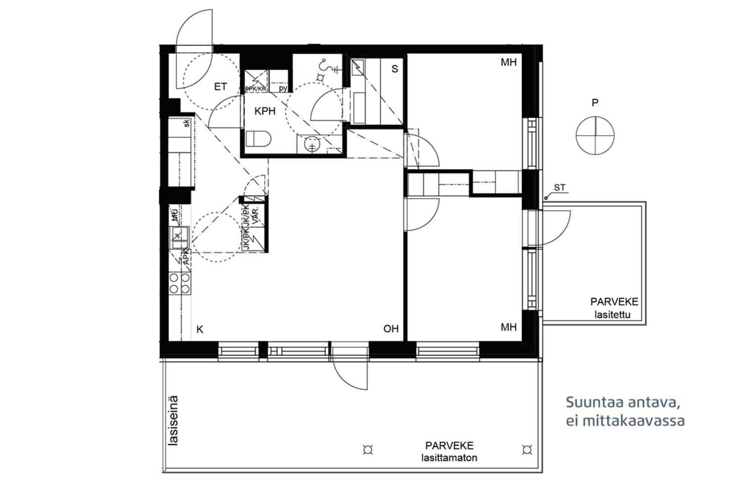 Kauniin kodin hillityt materiaalit ja tyylikäs keittiö antavat raamit monenlaiselle sisustamiselle. Kodin keskipiste on olohuoneeseen avautuva keittiö ja ruokailutila. Olohuoneesta pääsee tilavalle lasittamattomalle parvekkeelle ja isommasta makuuhuoneesta asunnon toiselle, lasitetulle parvekkeelle.