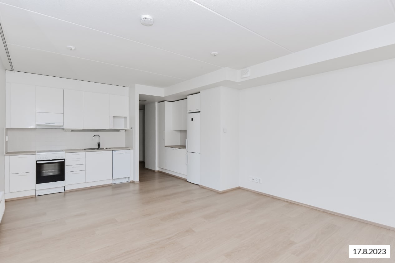 Huoneiston lattiat ovat valkaistua tammea mukailevaa laminaattia. Keittiön kaapistot ovat valkoiset ja kaapistojen välitila on laatoitettu vaaleilla laatoilla. Työtaso on vaalean saarnin väristä laminaattia. Keittiön varusteisiin kuuluu valkoiset kodinkoneet, keraaminen liesi, astianpesukone, jääkaappipakastin sekä varaus mikroaaltouunille.