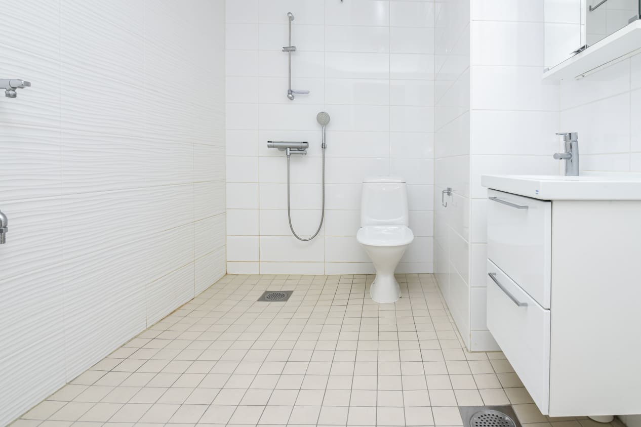 Asuinhuoneiden lattiapinnat ovat valkaistua tammea mukailevaa laminaattia. Keittiön kaapistot ovat valkoiset ja kaapistojen välitila on laatoitettu vaaleilla laatoilla. Työtaso on vaalean saarnin väristä laminaattia. Keittiön varusteisiin kuuluu valkoiset kodinkoneet, keraaminen liesi, astianpesukone, jääkaappipakastin sekä varaus mikroaaltouunille. Kylpyhuoneen seinät ovat valkoista laattaa, jota elävöittää kaunis valkoinen kohokuvioitu tehostelaatta. Lattiat ovat väriltään pehmeän beiget. Kylpyhuoneen kalusteet ovat valkoiset, pyykinpesukoneelle ja kuivausrummulle varaus.