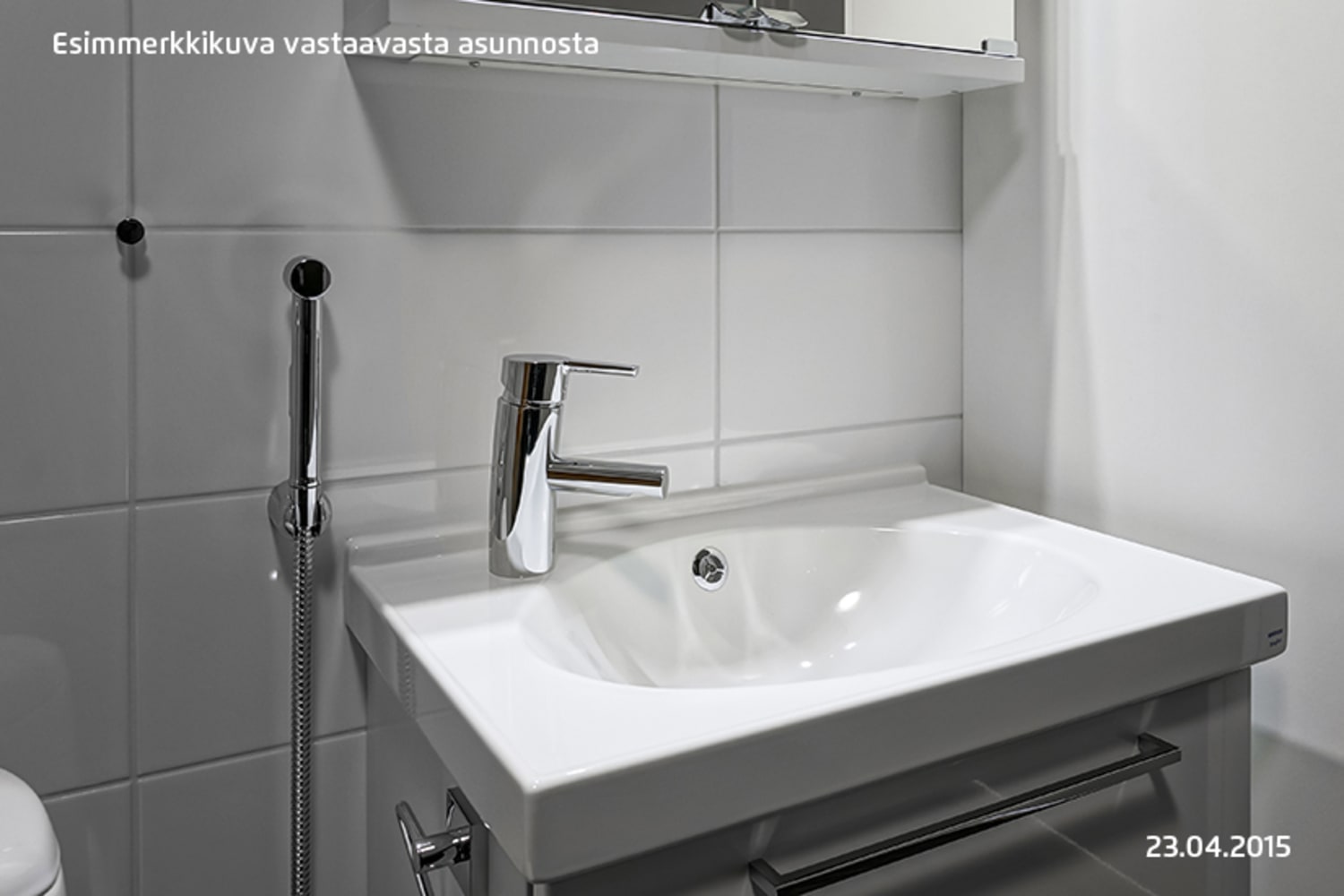 Huoneiston lattiat ovat valkaistua tammea mukailevaa laminaattia. Keittiön kaapistot ovat valkoiset ja kaapistojen välitila on laatoitettu harmaalla laatalla. Työtaso on tumman ruskeaa laminaattia. Keittiön varusteisiin kuuluu valkoiset kodinkoneet, keraaminen liesi, astianpesukone, kylmälaitteet sekä varaus mikroaaltouunille. Ikkunallisen kylpyhuoneen seinät ovat valkoista laattaa, jota elävöittää tyylikäs harmaa kohokuvioitu tehostelaatta. Lattiat ovat väriltään harmaat. Kylpyhuoneen kalusteet ovat valkoiset, pyykinpesukoneelle ja kuivausrummulle varaus.