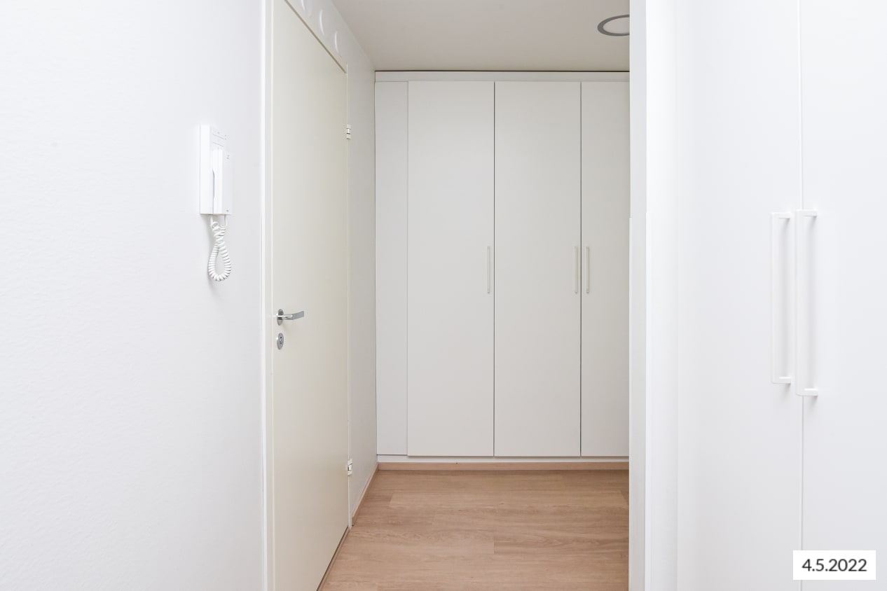 Huoneiston lattiat ovat valkaistua tammea mukailevaa laminaattia. Keittiön kaapistot ovat valkoiset ja kaapistojen välitila on laatoitettu vaaleilla laatoilla. Työtaso on vaalean saarnin väristä laminaattia. Keittiön varusteisiin kuuluu valkoiset kodinkoneet, keraaminen liesi, astianpesukone, jääkaappipakastin sekä varaus mikroaaltouunille. Kylpyhuoneen seinät ovat valkoista laattaa, jota elävöittää kaunis valkoinen kohokuvioitu tehostelaatta. Lattiat ovat väriltään pehmeän beiget. Kylpyhuoneen kalusteet ovat valkoiset, pyykinpesukoneelle ja kuivausrummulle varaus.