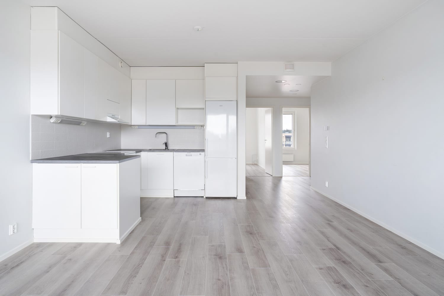 Vaaleasävyisen kodin lattiat ovat valkaistua tammea mukailevaa laminaattia. Keittiön kaapistot ovat valkoiset ja kaapistojen välitila on laatoitettu valkoisilla laatoilla. Työtaso on vaalean saarnin väristä laminaattia. Keittiön varusteisiin kuuluu modernit valkoiset kodinkoneet, mm. liesi, astianpesukone, jääkaappipakastin sekä varaus mikroaaltouunille.