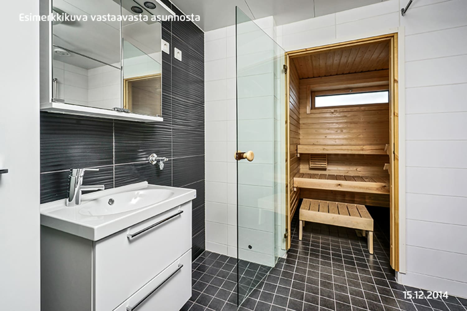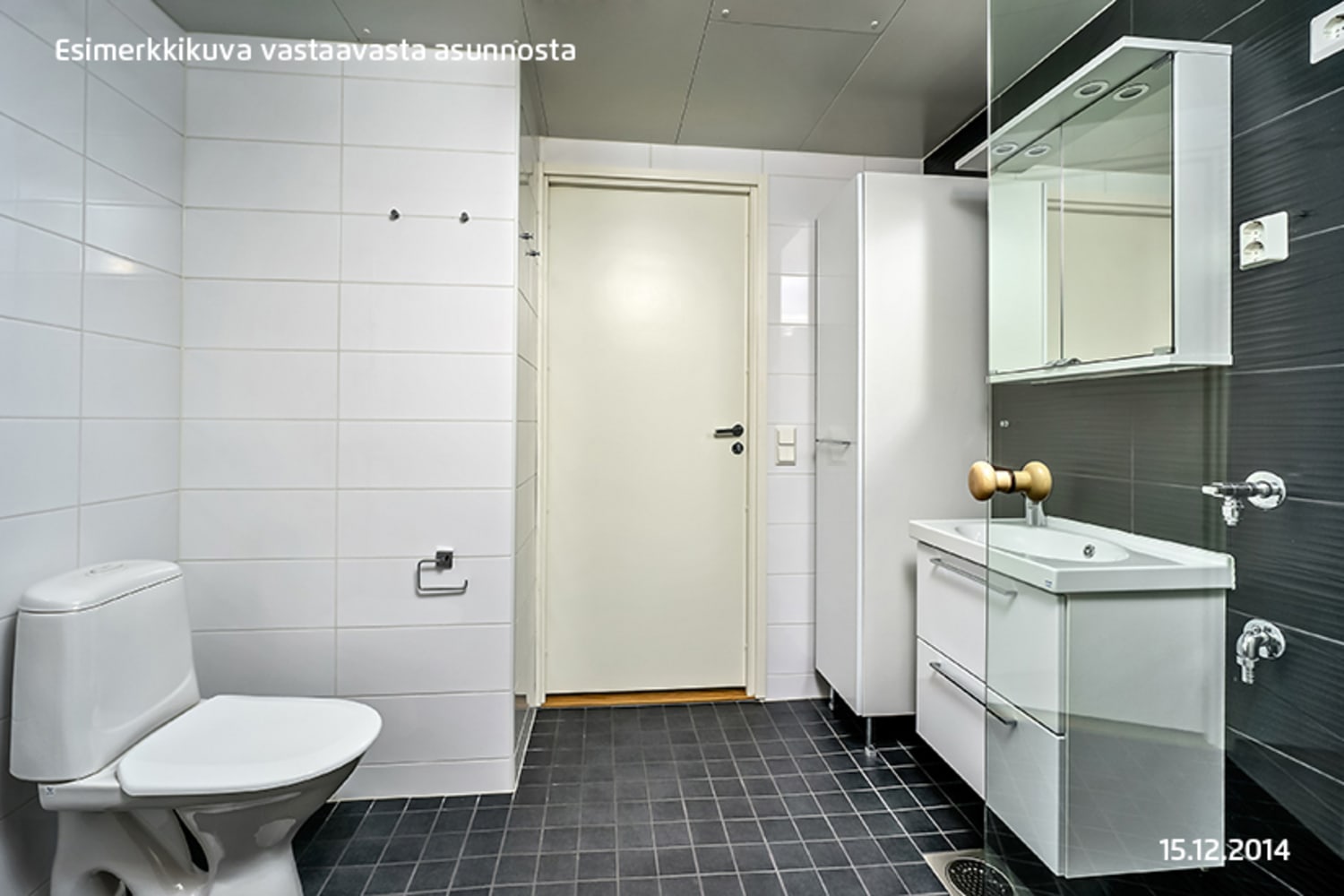 Kodin lattiat ovat valkaistua tammea mukailevaa laminaattia. Keittiön kaapistot ovat valkoiset ja kaapistojen välitila on laatoitettu harmaalla laatalla. Työtaso on harmaan ruskeaa laminaattia. Keittiön varusteisiin kuuluu valkoiset kodinkoneet; keraaminen liesi, astianpesukone, kylmälaitteet sekä varaus mikroaaltouunille. Kylpyhuoneen seinät ovat valkoista laattaa, jota elävöittää tumma kohokuvioitu tehostelaatta. Lattiat ovat väriltään tumman harmaat. Kylpyhuoneen kalusteet ovat valkoiset, pyykinpesukoneelle ja kuivausrummulle on varaus.