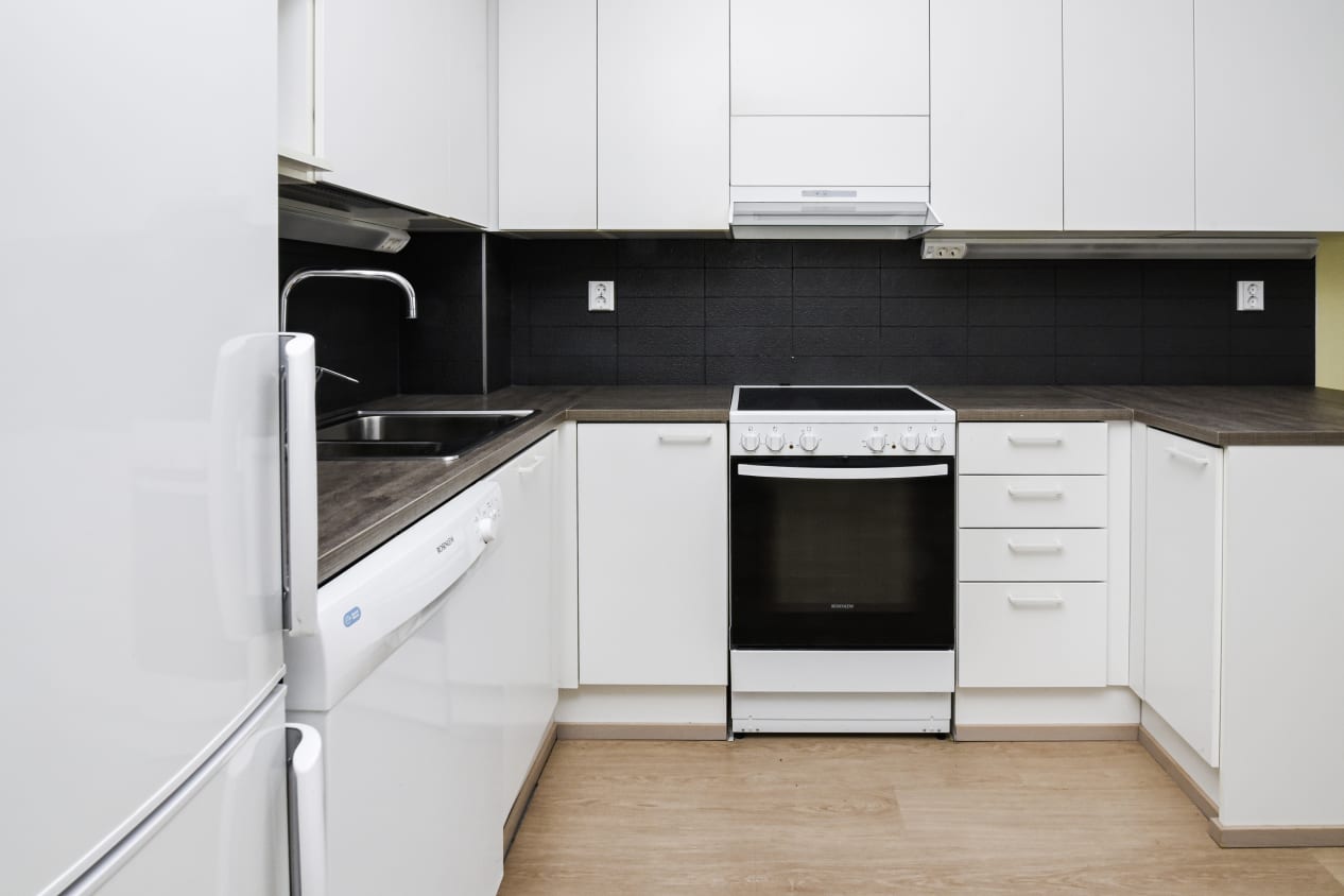 Kauniin kodin lattiat ovat valkaistua tammea mukailevaa laminaattia. Keittiön kaapistot ovat valkoiset ja kaapistojen välitila on laatoitettu harmaalla laatalla. Työtaso on harmaan ruskeaa laminaattia. Keittiön varusteisiin kuuluu modernit valkoiset kodinkoneet, mm. keraaminen liesi, astianpesukone, kylmälaitteet sekä varaus mikroaaltouunille.