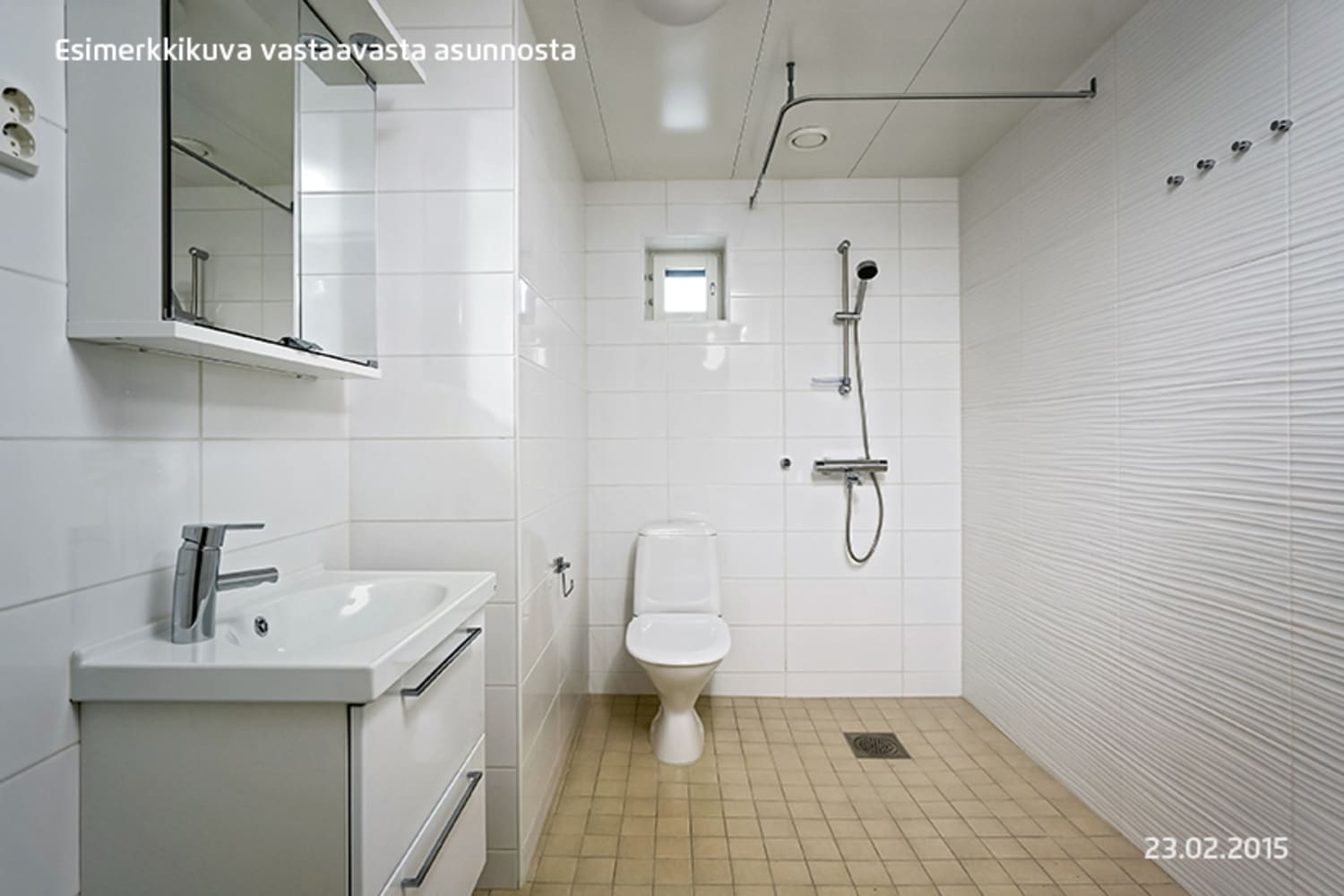 Kylpyhuoneen seinät ovat valkoista laattaa, jota elävöittää kaunis valkoinen kohokuvioitu tehostelaatta. Lattiat ovat väriltään pehmeän beiget. Kylpyhuoneen kalusteet ovat valkoiset, pyykinpesukoneelle ja kuivausrummulle varaus.