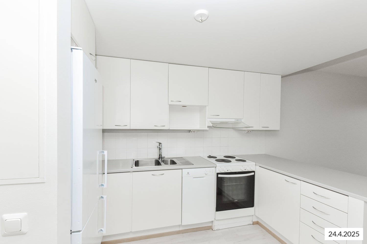 Vaaleasävyisen kodin lattiat ovat helppohoitoista laminaattia. Keittiökalusteiden ovet ovat raikkaan valkoiset ja kaapistojen välinen tila on laatoitettu valkoisella laatalla. Laminaattityötaso on niin ikään vaalea. Varustukseen kuuluu nelilevyinen liesitaso, kalusteuuni, astianpesukone ja kylmälaitteet. Kodinkoneet ovat valkoisia.