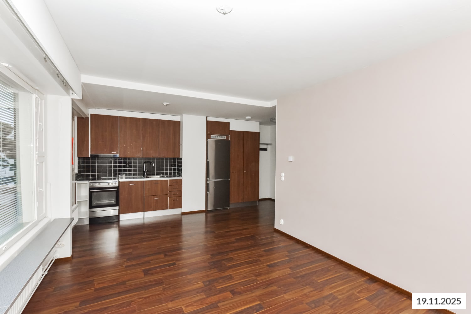 Asunnon lattiat ovat pähkinän väristä laminaattia ja muuten valkoisia seiniä elävöittää yksi vaaleaan siniseen vivahtava tehosteseinä. Keittokomeron kaapit ovat sävyltään pähkinää ja ylä- ja alakaappien välitila on laatoitettu kiiltävällä mustalla laatalla. Työtaso on mustalla kuvioitua laminaattia. Keittiön varusteisiin kuuluu rosteripintaiset jääkaappi-pakastin, keraaminen liesi ja liesikupu, integroitu astianpesukone sekä varaus mikroaaltouunille.