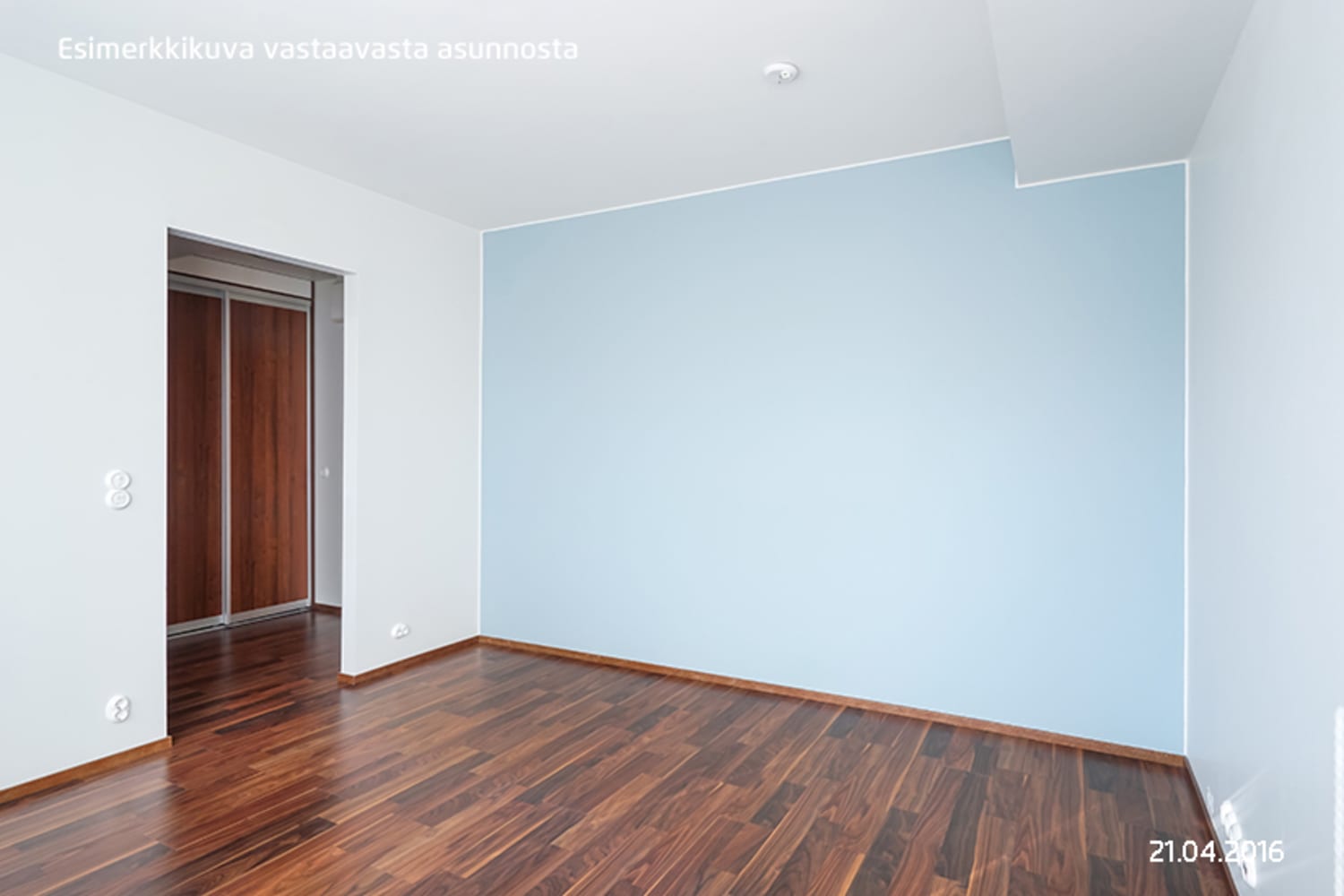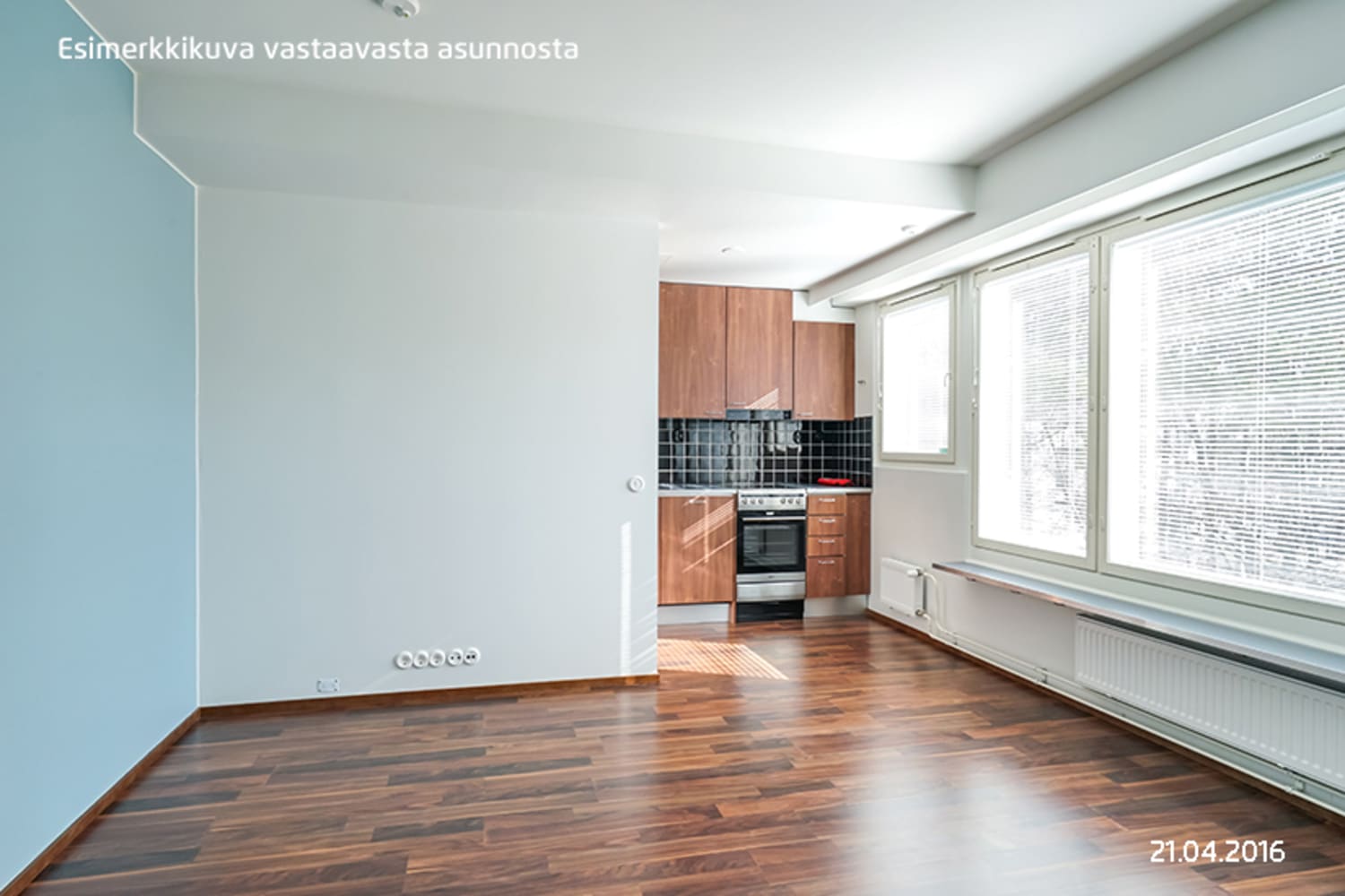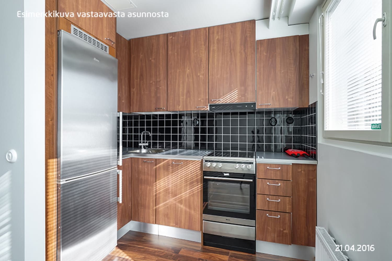Asunnon lattiat ovat pähkinän väristä laminaattia ja muuten valkoisia seiniä elävöittää yksi vaaleaan siniseen vivahtava tehosteseinä. Keittokomeron kaapit ovat sävyltään pähkinää ja ylä- ja alakaappien välitila on laatoitettu kiiltävällä mustalla laatalla. Työtaso on mustalla kuvioitua laminaattia. Keittiön varusteisiin kuuluu rosteripintainen jääkaappi-pakastin, keraaminen liesi ja liesikupu, integroitu astianpesukone sekä varaus mikroaaltouunille. Mustavalkoisen kylpyhuoneen seinät ovat kiiltävän valkoista laattaa. Lattia on laatoitettu kuusikulmaisella, mattamustalla klinkkerilaatalla. Pyykinpesukoneelle ja kuivausrummulle on varaus.