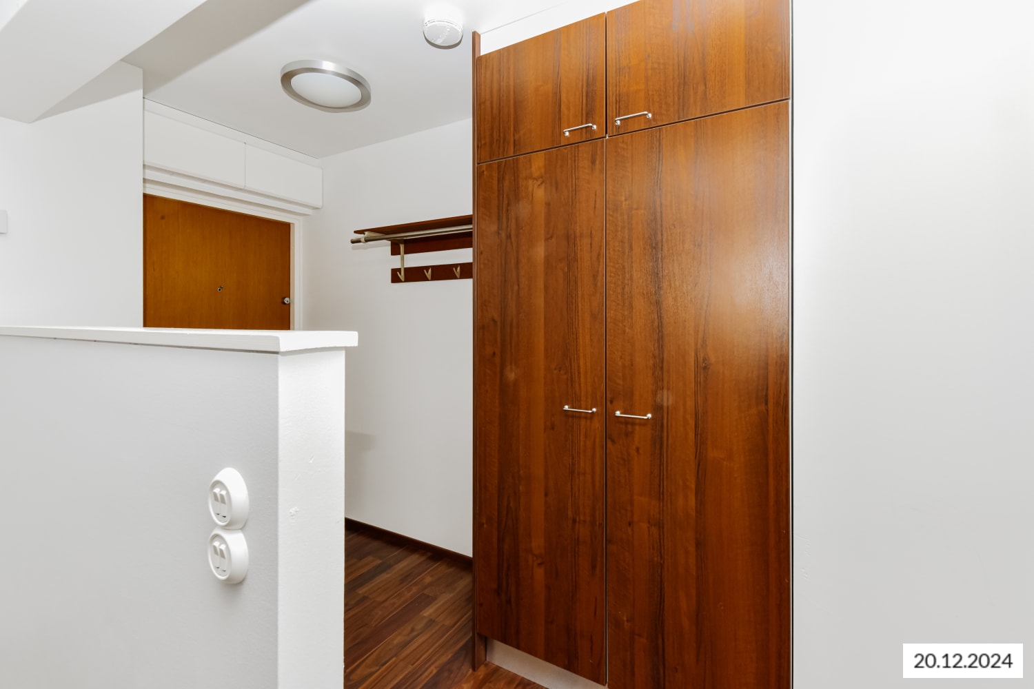 Aamuauringon puolelle suuntautuvaan pikkukotiin tulvii valoa koko asunnon leveydeltä isojen ikkunoiden kautta. Avoimen keittiönurkkauksen jatkoksi sopii pieni ruokapöytä. Eteinen on erotettu olohuoneesta matalalla seinäkkeellä, joka ei pimennä tilaa.