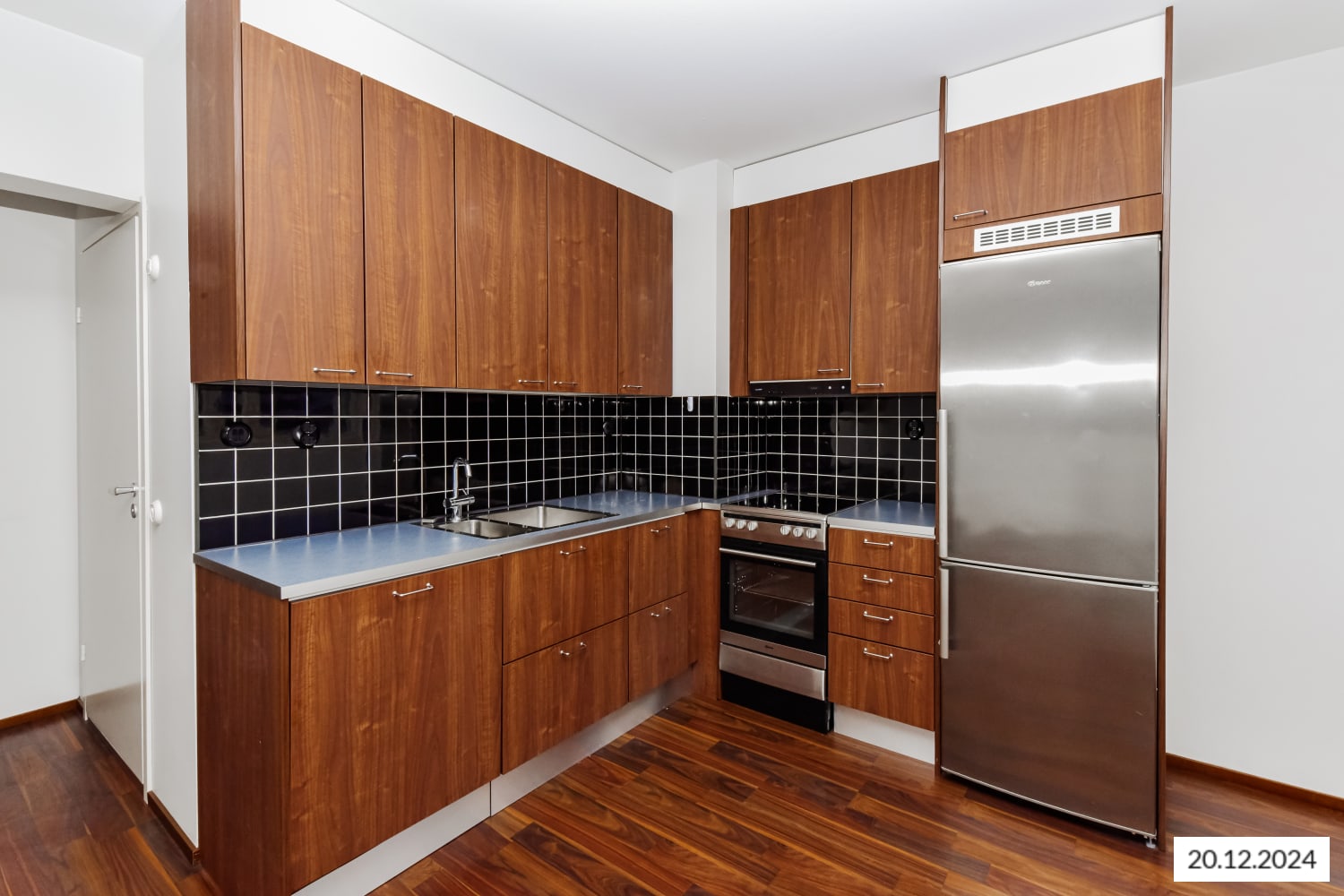 Asunnon lattiat ovat pähkinän väristä laminaattia ja muuten valkoisia seiniä elävöittää yksi vaaleaan siniseen vivahtava tehosteseinä. Keittokomeron kaapit ovat sävyltään pähkinää ja ylä- ja alakaappien välitila on laatoitettu kiiltävällä mustalla laatalla. Työtaso on mustalla kuvioitua laminaattia. Keittiön varusteisiin kuuluu rosteripintainen jääkaappi-pakastin, keraaminen liesi ja liesikupu, integroitu astianpesukone sekä varaus mikroaaltouunille. Mustavalkoisen kylpyhuoneen seinät ovat kiiltävän valkoista laattaa. Lattia on laatoitettu kuusikulmaisella, mattamustalla klinkkerilaatalla. Pyykinpesukoneelle ja kuivausrummulle on varaus.