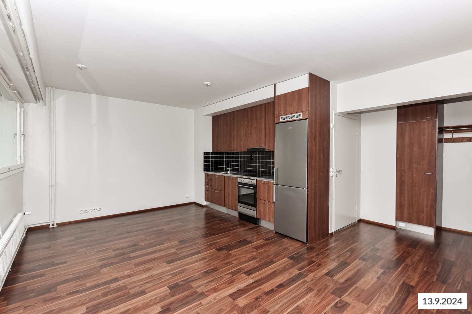 Aamuauringon puolelle suuntautuvaan pikkukotiin tulvii valoa koko asunnon levyisten isojen ikkunoiden kautta. Keittiökalusteet on sijoitettu selkeästi yhdelle seinälle ja oleskelutila on helppo sisustaa mieleisekseen.