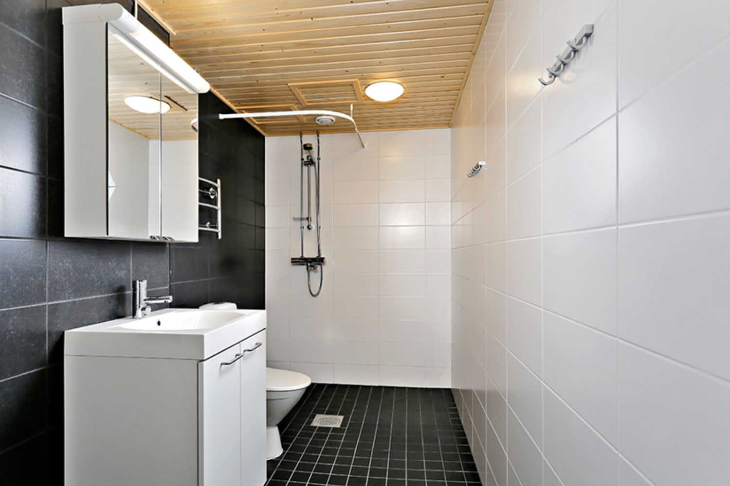 Asuinhuoneissa on valkaistu tammilaminaattilattia ja kylpyhuoneet on kalustettu eleettömän tyylikkäästi antrasiitinharmaalla, valkoisella ja melkein mustalla. Keittiökaapistot ovat valkoiset, kalusteväleissä kaakelointi valkoista eläväpintaista neliökaakelia ja valkoinen laminaattityötaso täydentää puhtaan selkeän tyylin. Varusteina keraaminen liesi, astianpesukone sekä jää-pakastinkaappi. Ikkunoissa on valkoiset sälekaihtimet.