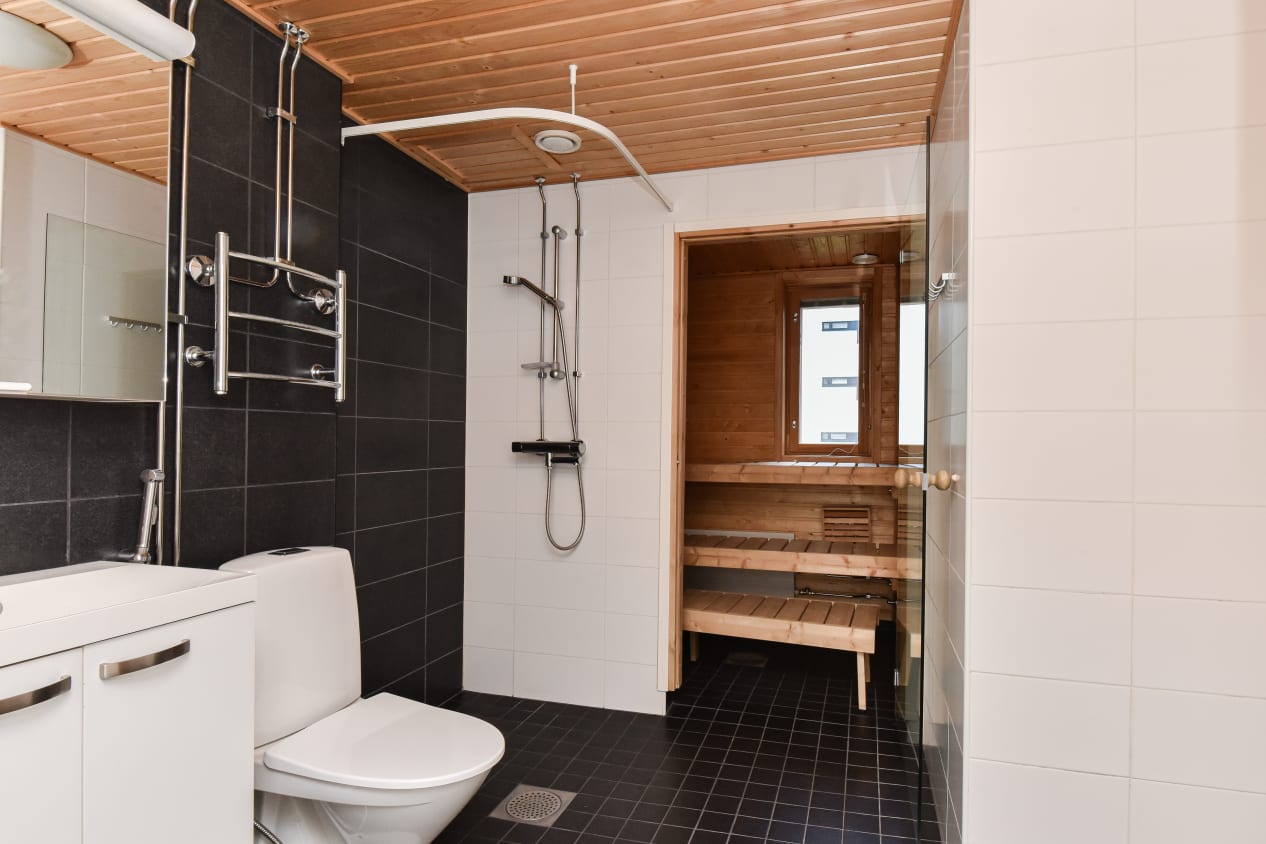 Asuinhuoneissa on valkaistu tammilaminaattilattia ja kylpyhuoneet on kalustettu eleettömän tyylikkäästi antrasiitinharmaalla, valkoisella ja melkein mustalla. Keittiökaapistot ovat valkoiset, kalusteväleissä kaakelointi valkoista eläväpintaista neliökaakelia ja valkoinen laminaattityötaso täydentää puhtaan selkeän tyylin. Varusteina keraaminen liesi, astianpesukone sekä jää-pakastinkaappi. Ikkunoissa on valkoiset sälekaihtimet.