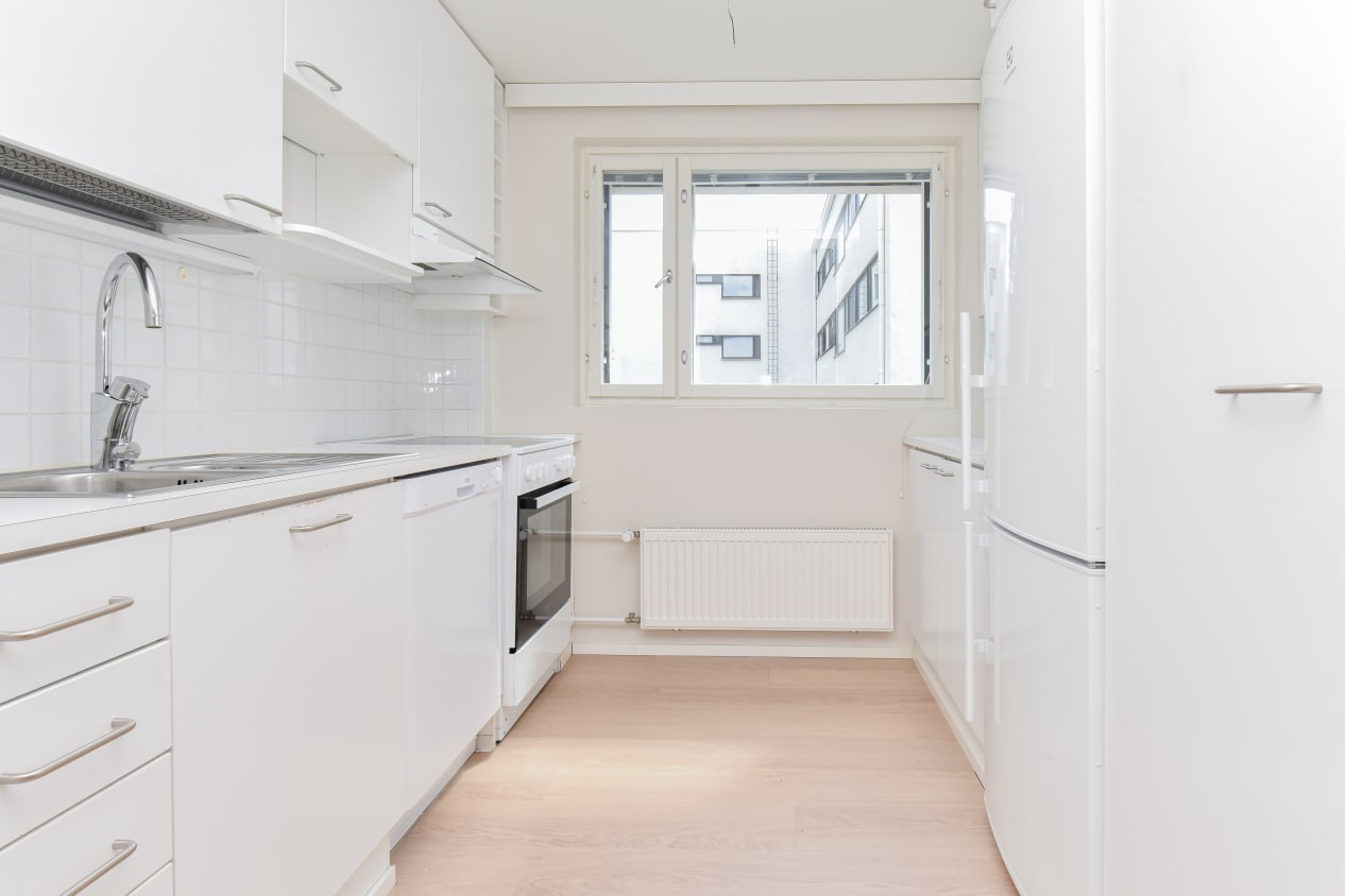 Juuri oikean kokoinen kaksio valloittaa valoisuudellaan ja isolla ilta-aurinkoon avautuvalla parvekkeellaan. Kulmahuoneiston valtteina ovat myös rauhallinen seinanaapuriton makuuhuone ja oma ikkunallinen sauna.