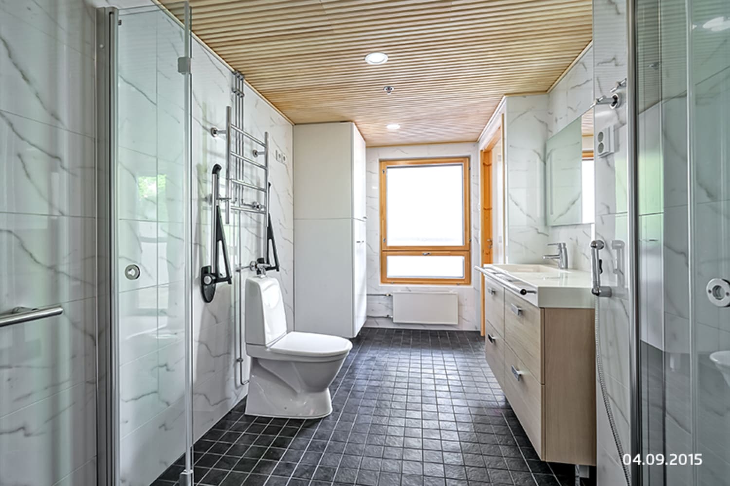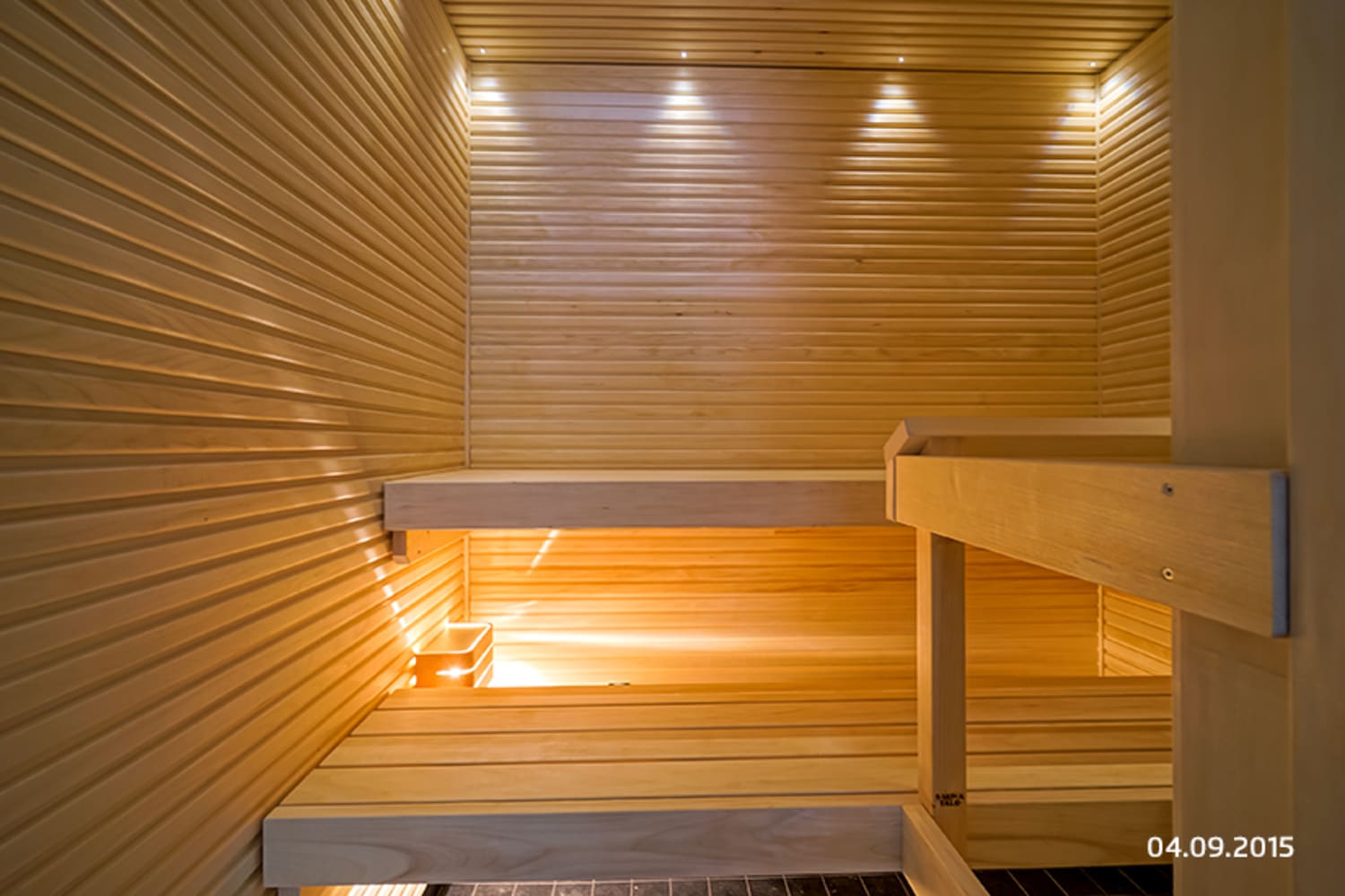 Asuinhuoneiden lattiamateriaalina on saarniparketti. Saunaosastolla sävyt ovat tyylikkäät: lattiassa on musta laatoitus, seinissä on valkoista marmorikuvioista laattaa. Keittiössä kaapistojen ovet ovat puhtaan valkoiset ja kaapistojen ja tasojen välitilassa on valkoinen lasi. Musta kvartsikomposiittitaso antaa tilaan ryhdikkään säväyksen. Varusteina on kalusteisiin integroitu astianpesukone ja kylmälaitteet, keraaminen liesitaso ja kalusteuuni.