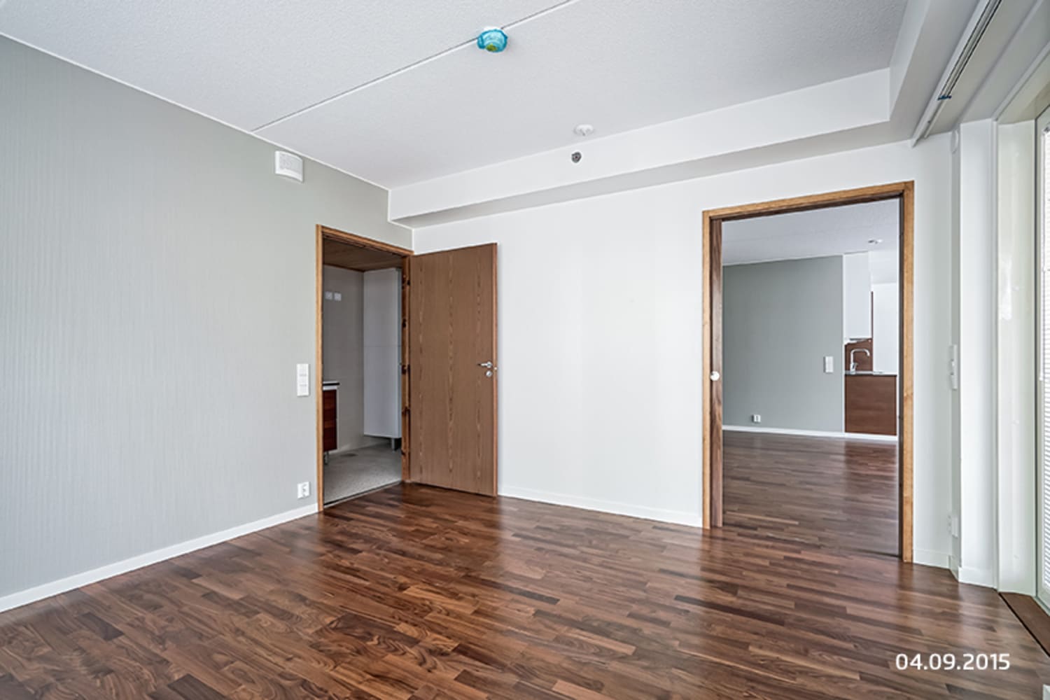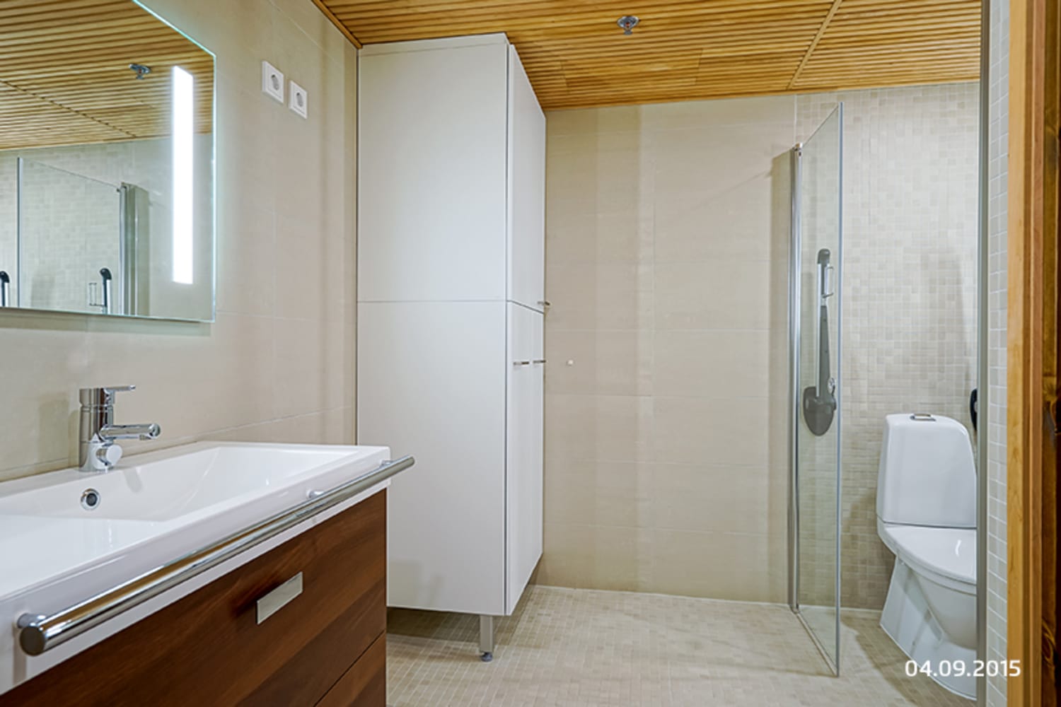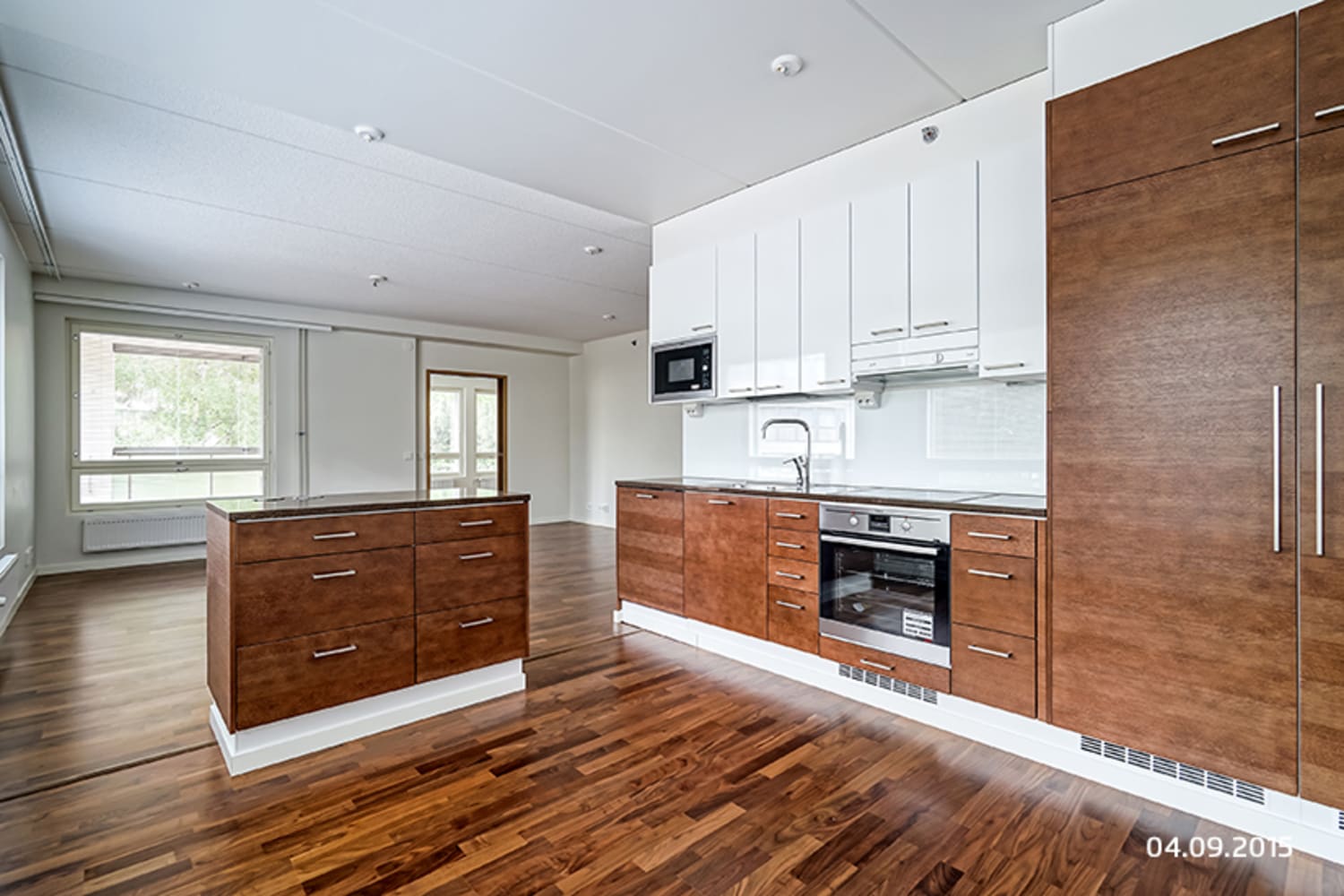 Asuinhuoneiden lattiamateriaalina on pähkinäparketti. Saunaosastolla sävyt ovat pehmeät: lattiassa on luonnonvalkoista mosaiikkilaattaa, seinissä on beigen sävyinen laatoitus, tehosteena samanvärinen mosaiikkilaatta. Keittiössä yläkaapit ovat valkoiset ja alakaapit ja korkeat komerot saarniviilua. Kaapistojen ja tasojen välitilassa on valkoinen lasi. Työtaso on mustanruskeaa kvartsikomposiittia. Varusteina on kalusteisiin integroitu astianpesukone ja kylmälaitteet, keraaminen liesitaso ja kalusteuuni.