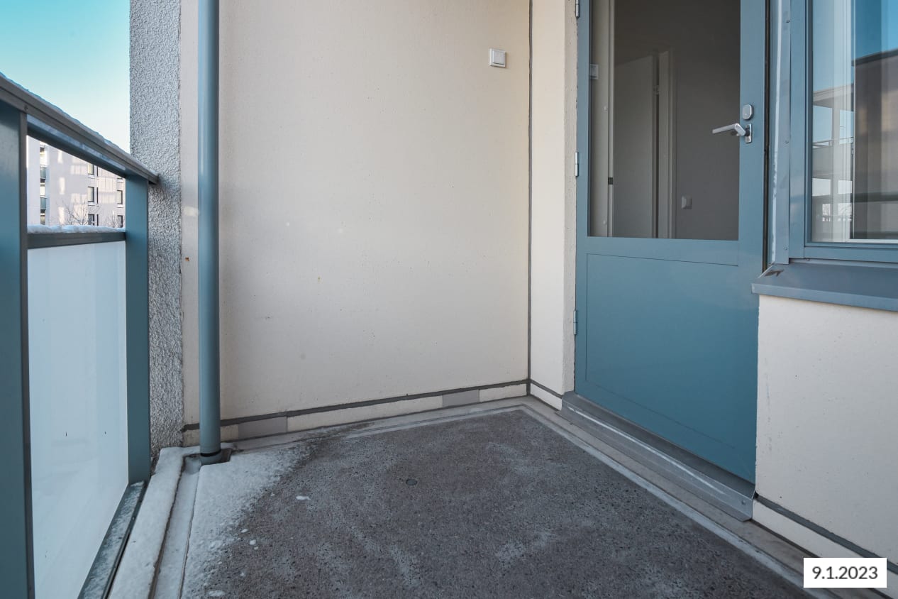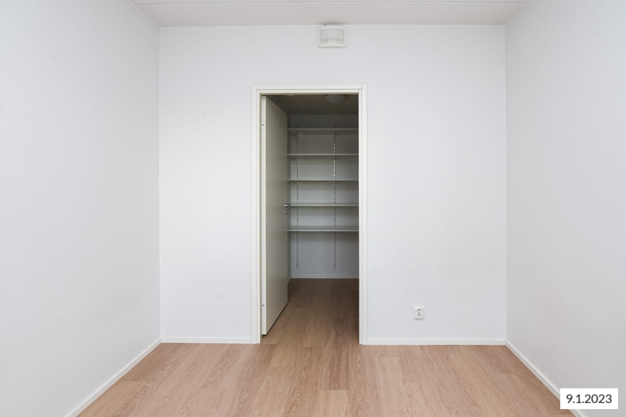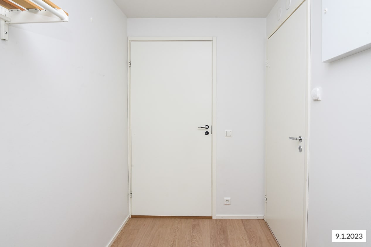 Kaksiossa on selkeä ja käytännöllinen pohjaratkaisu. Säilytyshuolet katoavat makuuhuoneen tilavaan vaatehuoneeseen ja omalla parvekkeella on mukava seurata vuodenaikojen vaihtelua.