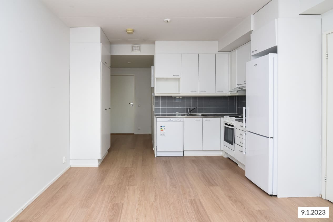 Käytännöllinen avokeittiö on sijoitettu oleskelutilan eteisen puoleiseen päätyyn ja siellä on valmiina astianpesukone. Kaakeliseinäisessä kylpyhuoneessa on tilavaraus pesukoneelle ja liitännät ovat valmiina.