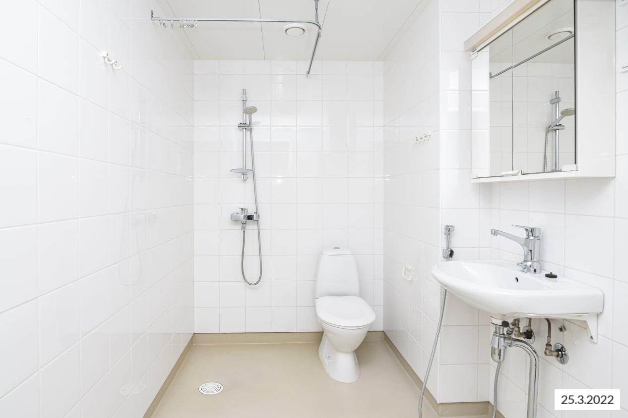 Tilavassa kylpyhuoneessa on liitännät pesukoneelle. Asunto ja koko taloyhtiö piha mukaan lukien ovat savutonta aluetta.
