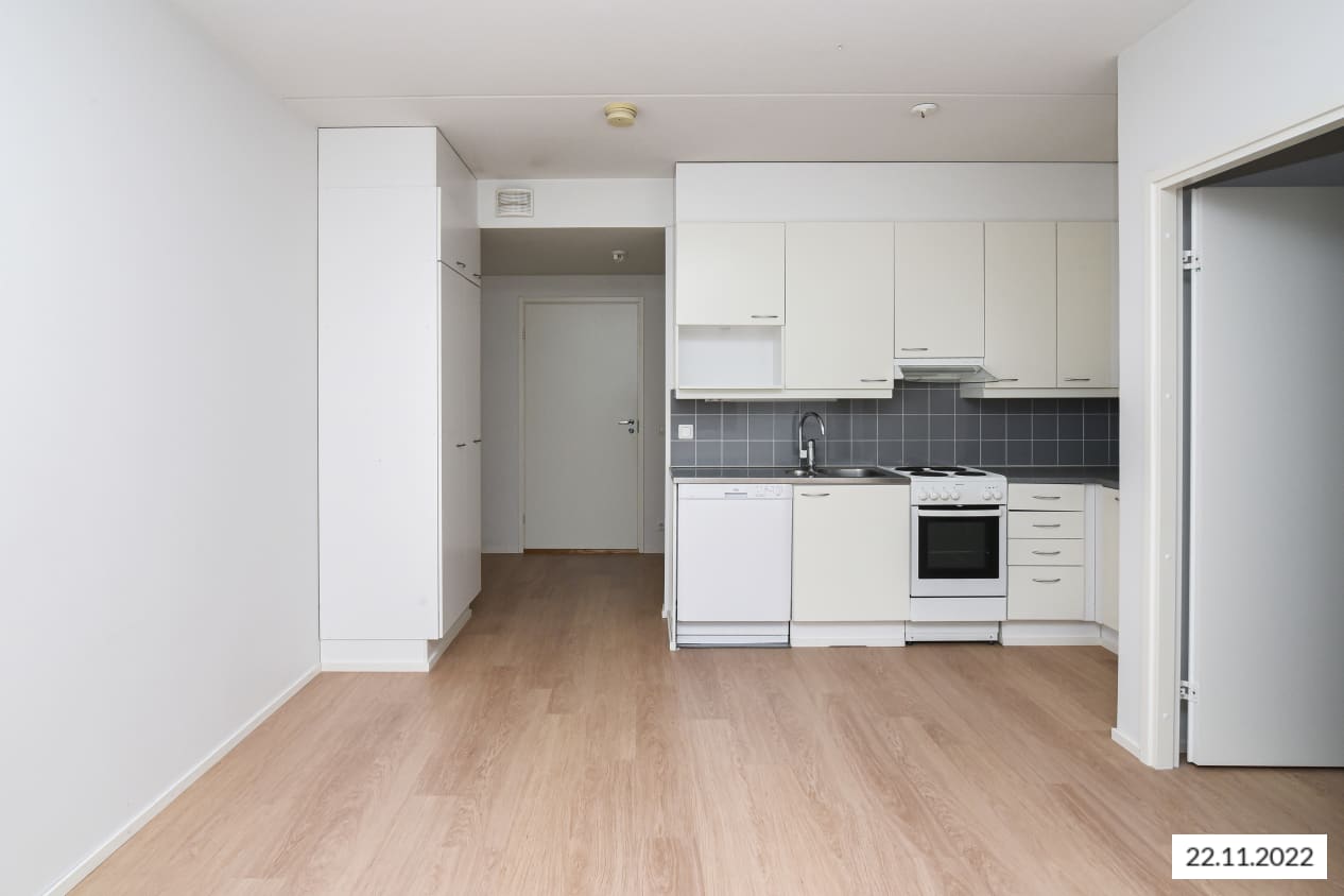 Tässä kaksiossa on selkeä ja avara pohjaratkaisu. Keittiö avautuu oleskelutilaan luoden miellyttävän oleskelutilan. Lattoat ovat siistiä puulaminaattia ja seinät on maalattu. Makuuhuoneesta avautuu säilytystilana toimiva vaatehuone. Tilavassa kylpyhuoneessa on kaakeloidut seinät ja tilavaraus pyykinpesukoneelle.