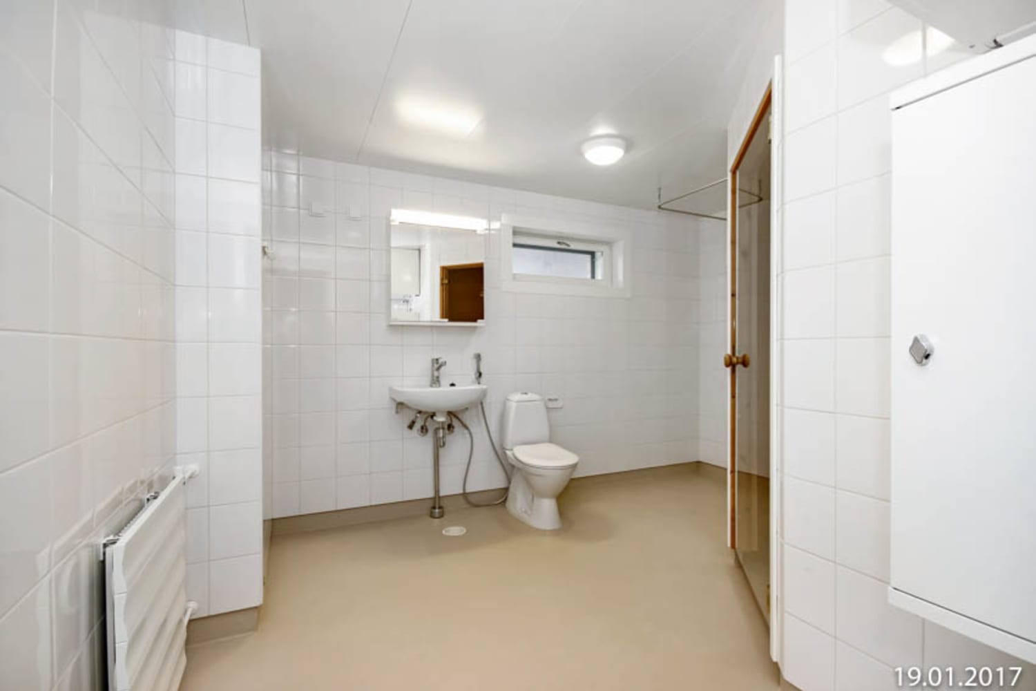 Tilavassa kylpyhuoneessa on varaus ja liitännät pyykinpesukoneelle.