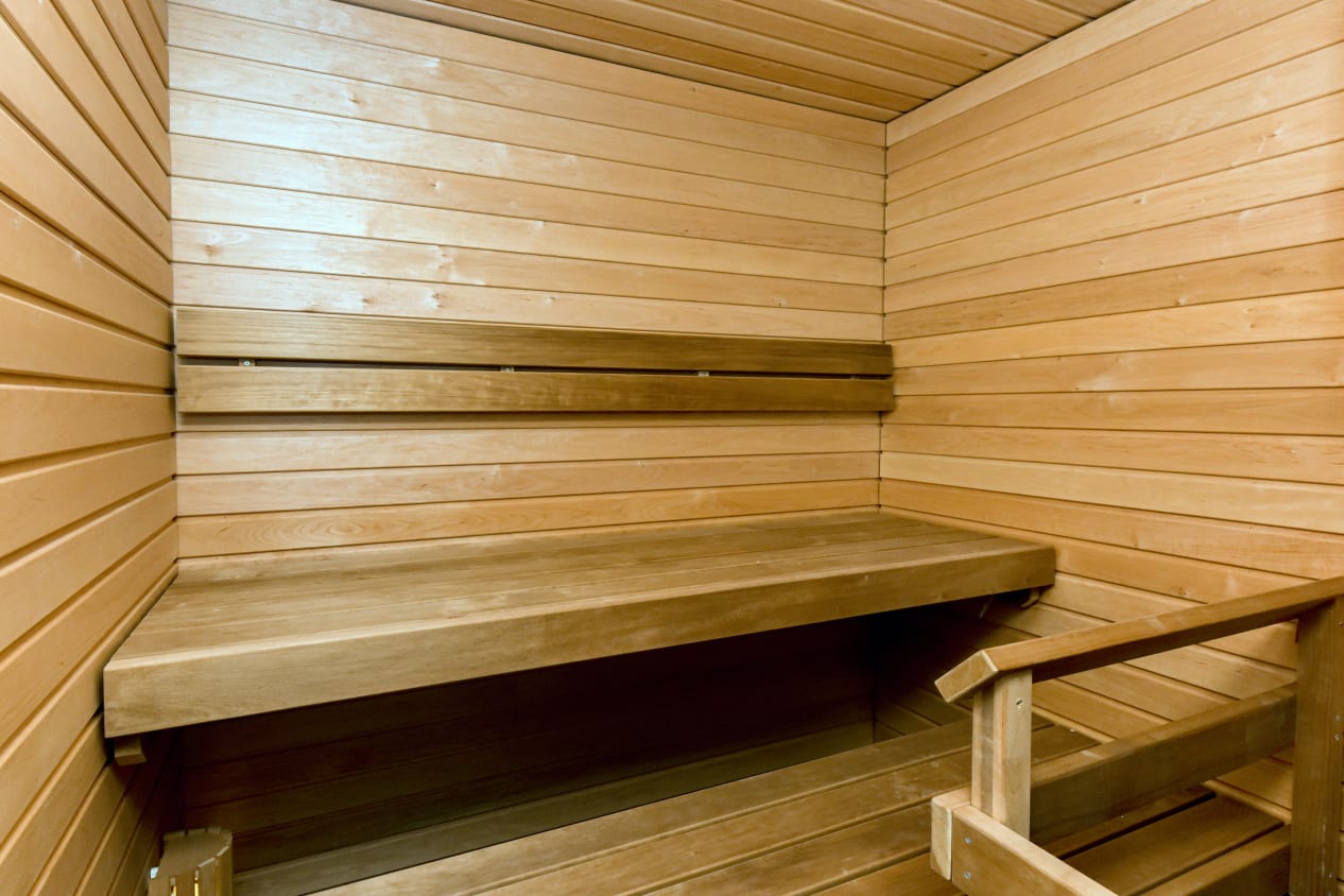 Oma sauna on paras paikka rentoutumiselle. Saunan pesuhuoneessa ja erillisessä wc:ssä on valkoiset SATOn Kide-malliston kalusteet. Seinät ovat valkoista laattaa ja lattia on harmaa. Pyykinpesukoneelle ja kuivausrummulle on oma paikka.