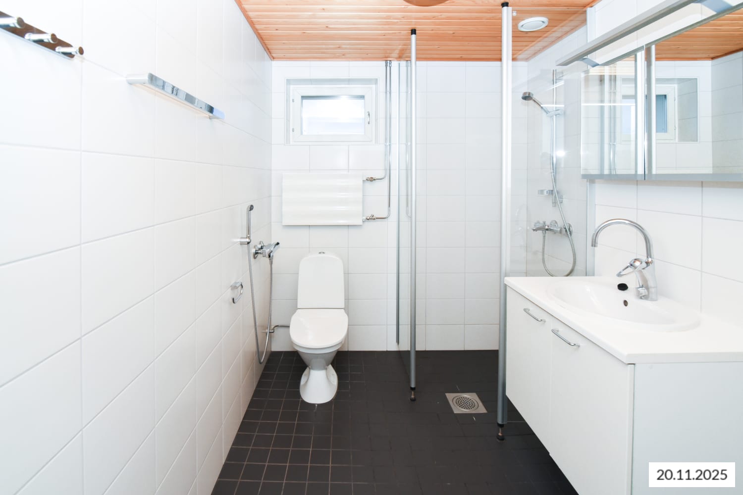 Kylpyhuoneessa on lattialämmitys, seinät isoa valkoista laattaa ja lattiassa tyylikäs musta klinkkerilaatoitus. Kiinteät kalusteet ovat sileäpintaiset ja valkoiset.