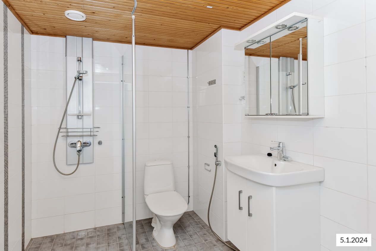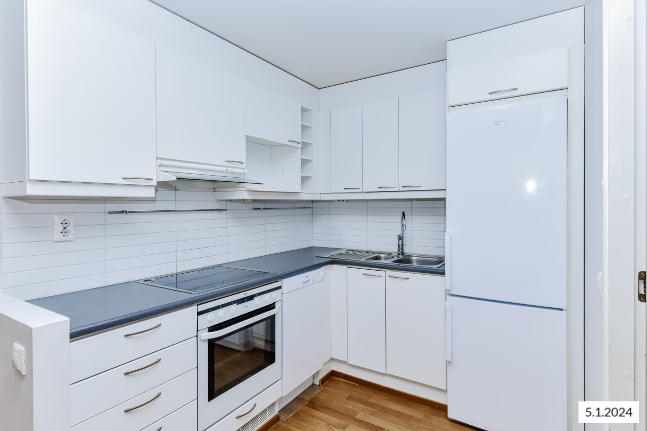 Asuinhuoneiden lattiamateriaaliksi on valittu tyylikäs parketti. Mukavuuslattialämmitetyn kylpyhuoneen lattialaattojen sävynä on murrettu harmaa ja isoja valkoisia seinäkaakeleita on piristetty harmaasävyisellä mosaiikkiboordilla. Keittokomeron kaapistoissa on kodikas profiili ja taivereunaiset laminaattipöytätasot ovat grafiitinharmaat. Astianpesukone, jää-pakastinkaappi sekä keraaminen liesi uuneineen kuuluvat kodin vakiovarustukseen.