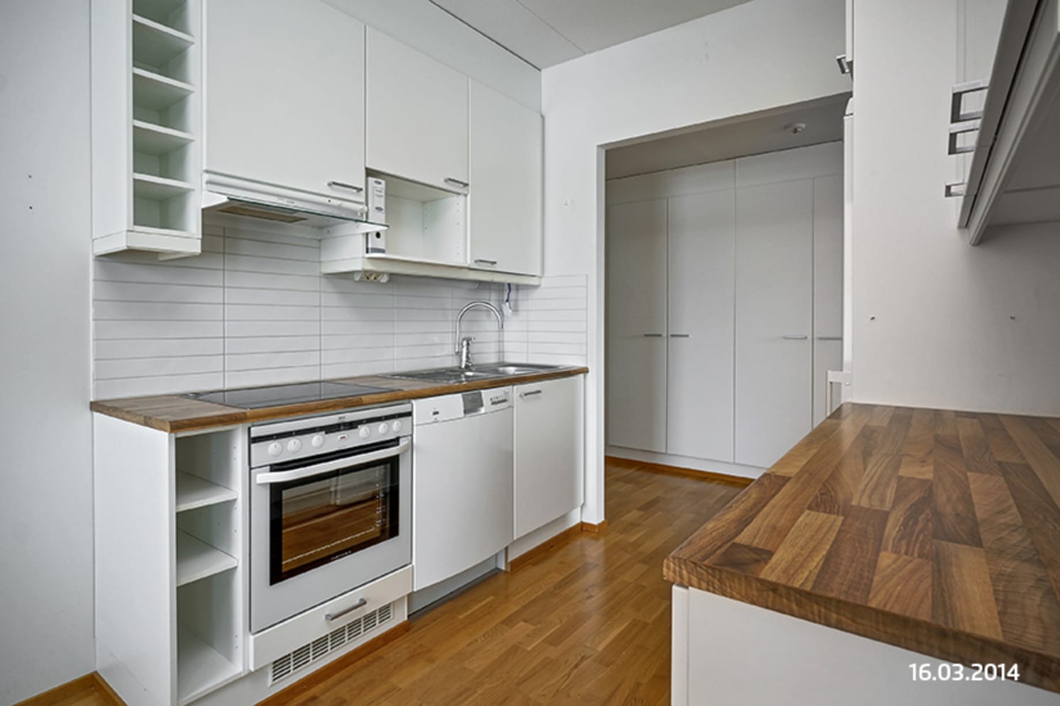 Asuinhuoneiden viihtyisyyttä lisää kaunis lautaparkettilattia. Mukavuuslattialämmitetyn kylpyhuoneen valkoisia isoja seinäkaakeleita on maustettu tummanruskeilla lattialaatoilla ja ruskeansävyisellä mosaiikkiboordilla. Keittiön laminaattityötasot mukailevat pähkinäpuuta ja kaapistoissa on selkeälinjaiset valkoiset ovet ja tyylitellyn kulmikkaat hopeiset vetimet. Keittiön vakiovarustukseen kuuluvat jää-pakastinkaappi, astianpesukone sekä laadukas keraaminen liesi uuneineen.
