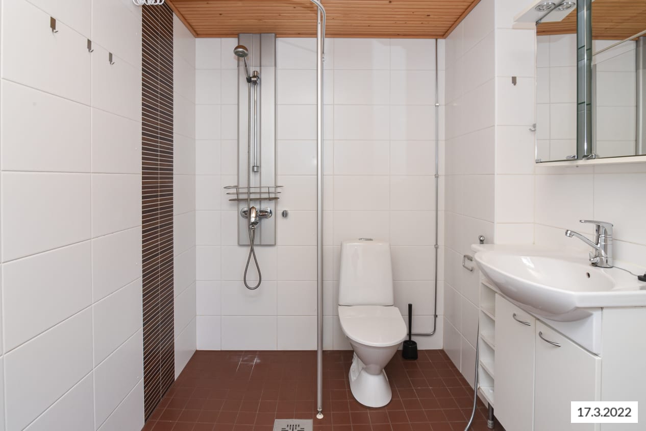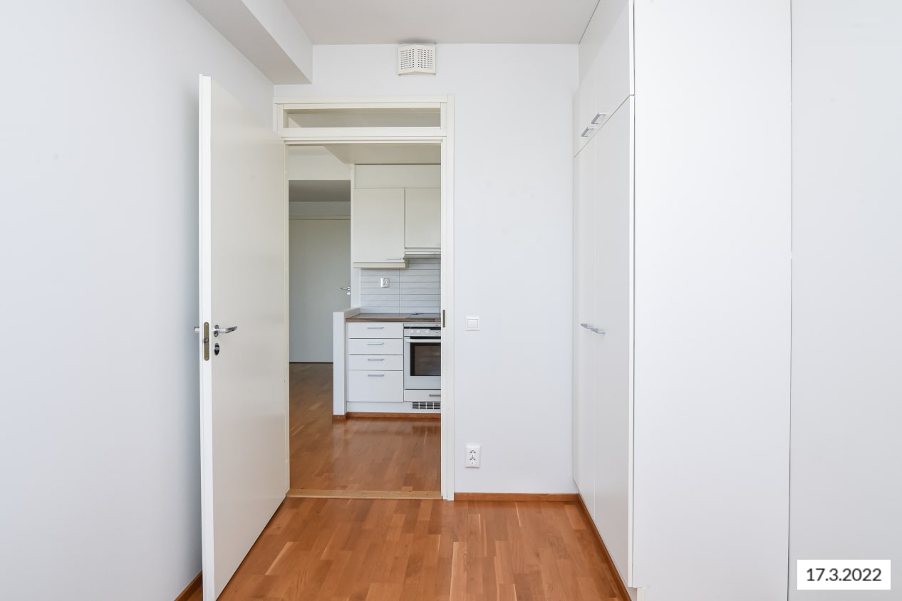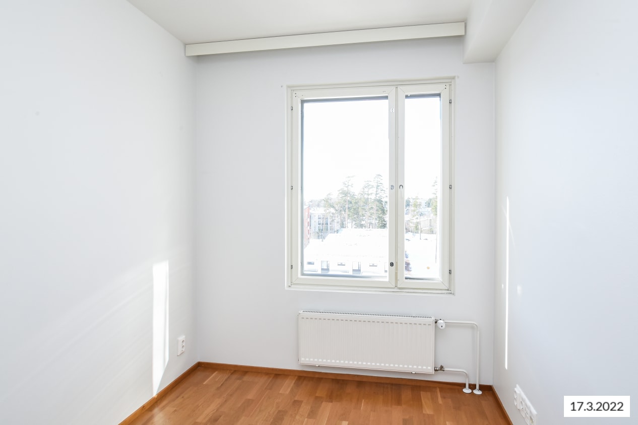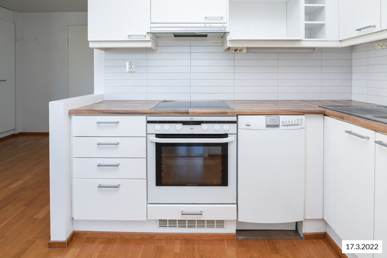 Asuinhuoneissa on vaaleat parkettilattiat. Mukavuuslattialämmitetyn kylpyhuoneen isoja mattavalkoisia seinäkaakeleita on maustettu pehmeällä ruskeansävyisellä pystyboordilla ja tummanruskealla lattialaatoituksella. Keittokomerossa on selkeälinjaiset kaapistot tyylikkäine vetimineen sekä pähkinäpuuta mukailevat taivereunaiset laminaattityötasot. Kodin vakiovarustukseen kuuluvat astianpesukone, jää-pakastinkaappi sekä keraaminen liesi uuneineen.