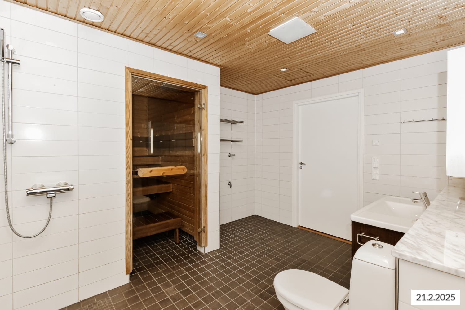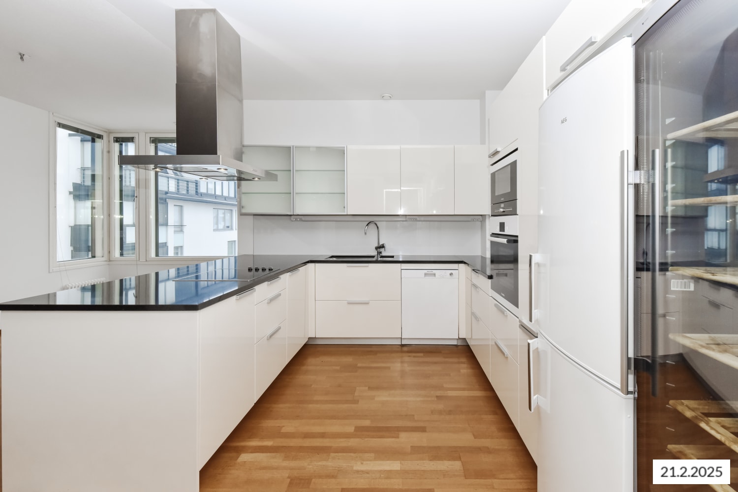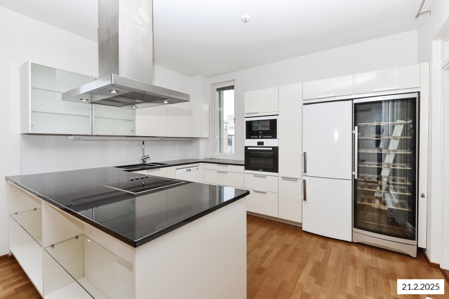 Asuinhuoneiden lattiat ovat kaunista tammilautaparkettia. Kauttaaltaan kaakeloidun mukavuuslattialämmitetyn kylpyhuoneen sävyinä ovat harmaa ja wenge, maustettuna valkoisella marmoritasolla ja saniteettikalusteilla sekä Gustavsbergin kromatuilla hanoilla. Keittiössä on Poggenpohlin valkoinen korkeakiiltoinen kalustus sekä Siemensin valkoiset jää-pakastinkaapit, astianpesukone, mikroaaltouuni ja keraaminen liesitaso uuneineen. Työtasot ovat Varpaisjärven mustaa graniittia ja kalusteväleissä on läpikuultava opaalilasi.