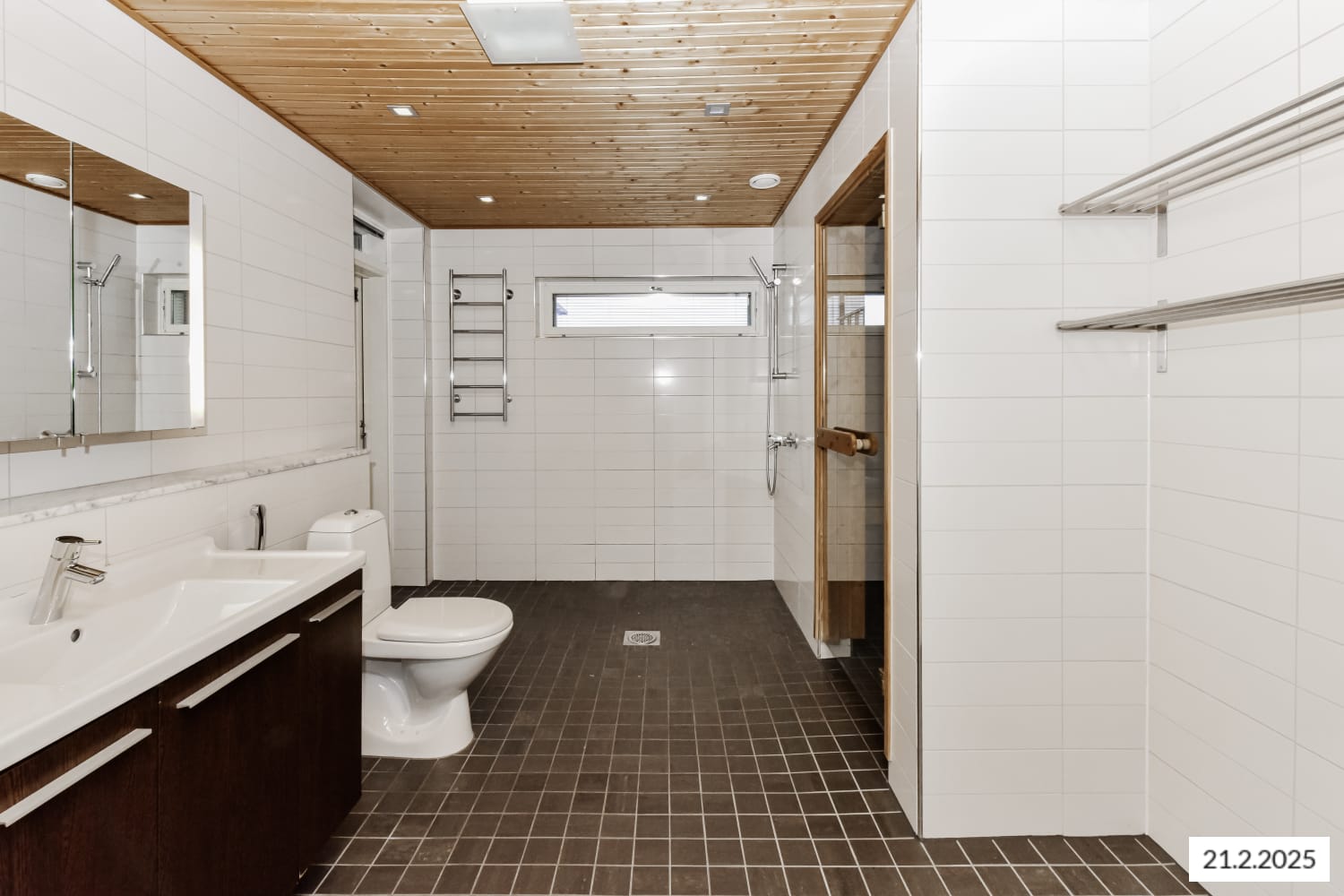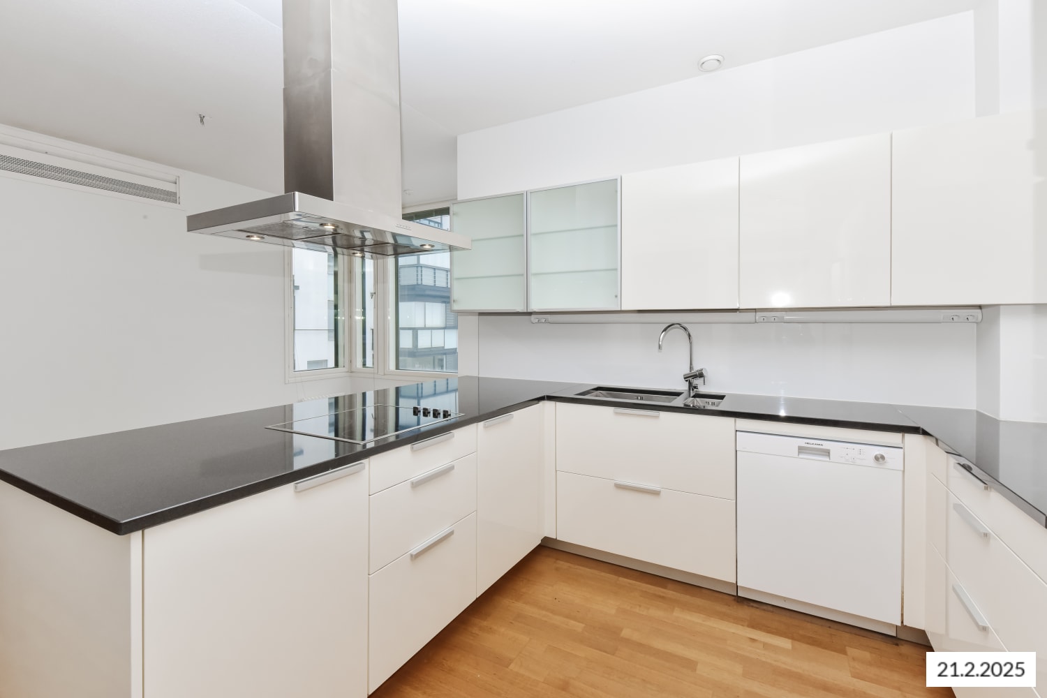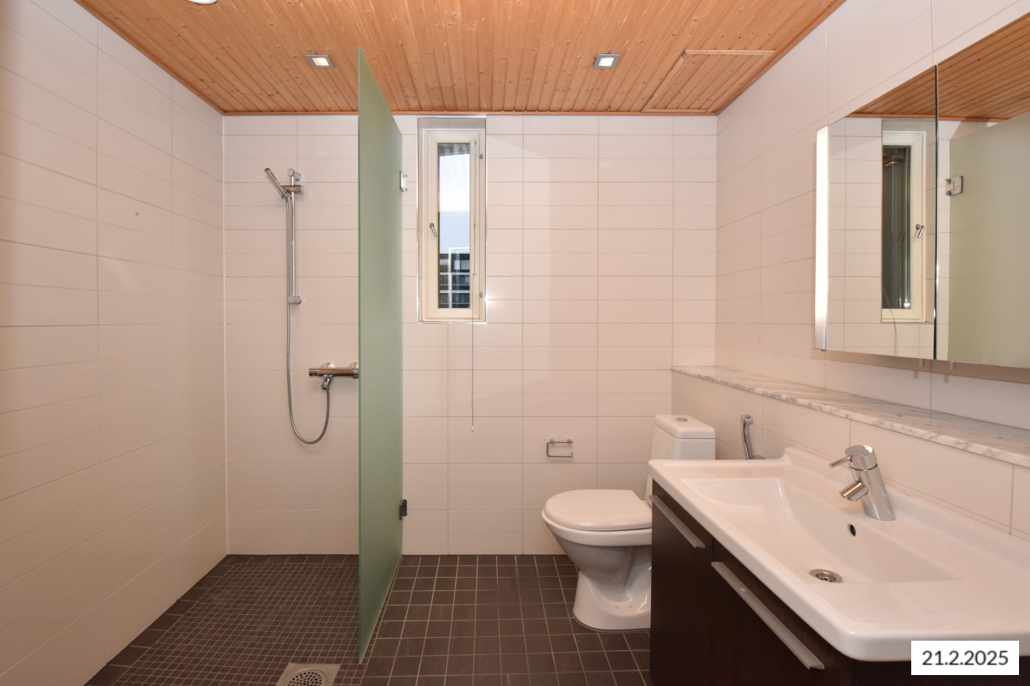 Asuinhuoneiden lattiat ovat kaunista tammilautaparkettia. Kauttaaltaan kaakeloidun mukavuuslattialämmitetyn kylpyhuoneen sävyinä ovat harmaa ja wenge, maustettuna valkoisella marmoritasolla ja saniteettikalusteilla sekä Gustavsbergin kromatuilla hanoilla. Keittiössä on Poggenpohlin valkoinen korkeakiiltoinen kalustus sekä Siemensin valkoiset jää-pakastinkaapit, astianpesukone, mikroaaltouuni ja keraaminen liesitaso uuneineen. Työtasot ovat Varpaisjärven mustaa graniittia ja kalusteväleissä on läpikuultava opaalilasi.